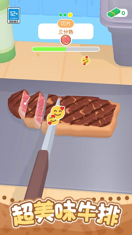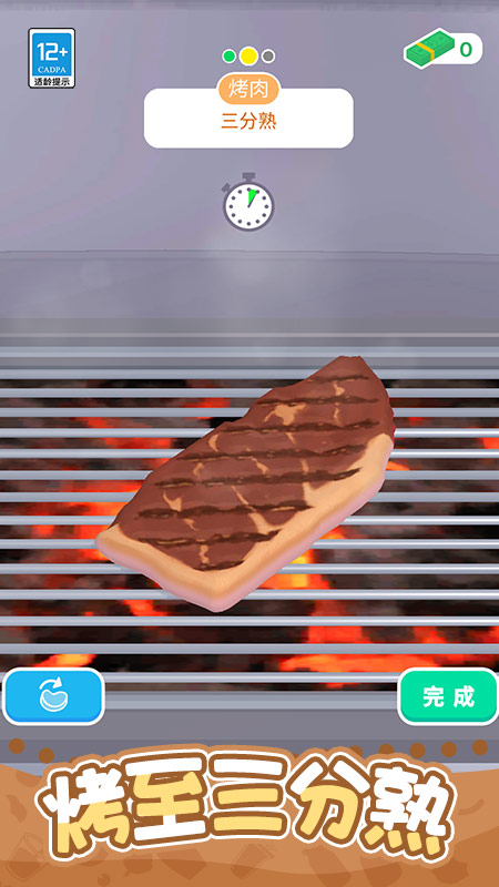 3、滑动屏幕控制翻面时机,观察肉色变化调整火力,拖动温度计至目标熟度,误差过大会扣分。