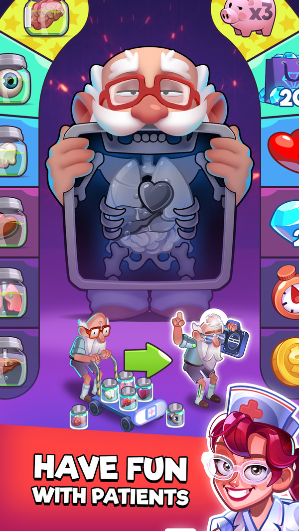 Crazy Hospital是一款融合荒诞医疗模拟与医院经营的游戏,玩家将担任奇葩医院的院长处理超现实病例。从会说话的南瓜头到需要接骨的透明人,每种特殊病患都需要定制化治疗方案。通过升级外星科技手术台与魔法药水调配室,解锁三十种匪夷所思的医疗设备。游戏内设多维宇宙急诊中心,随时会接收来自西部荒野的枪伤牛仔或未来世界的机器人病患。妥善管理医护人员情绪值避免他们被幽灵病人吓晕,将盈利投入建设更先进的彩虹色病房,最终打造闻名多元宇宙的梦幻医疗机构。