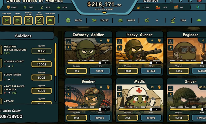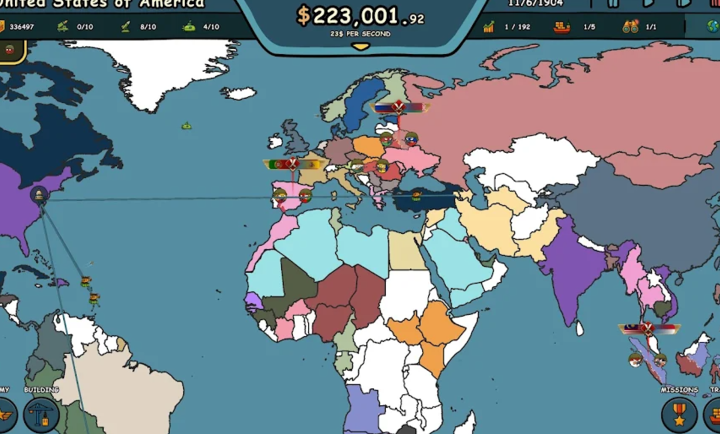 1、初始选择一个国家球作为起点,通过时间积累金币,用于升级经济或军事设施。