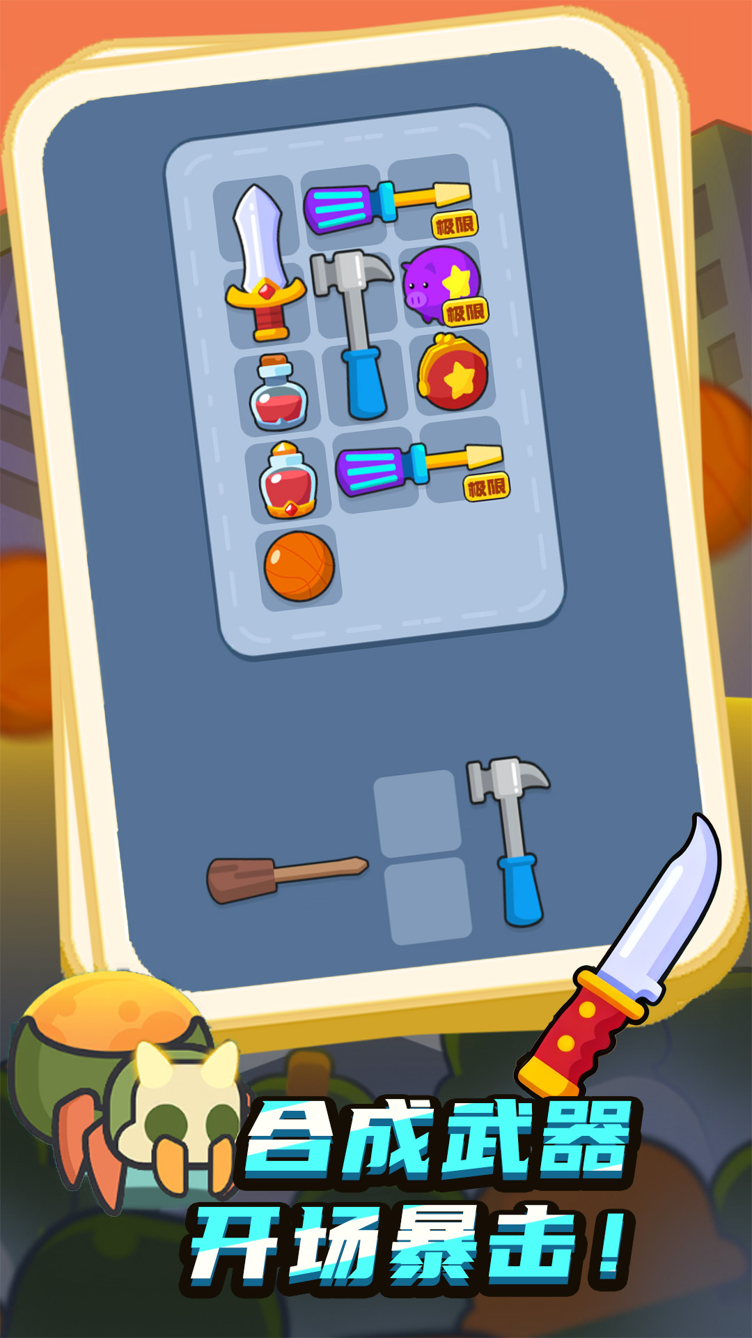 3、点击合成相同的武器,射击一波波僵尸,攻击力全新升级,获取新的技能。