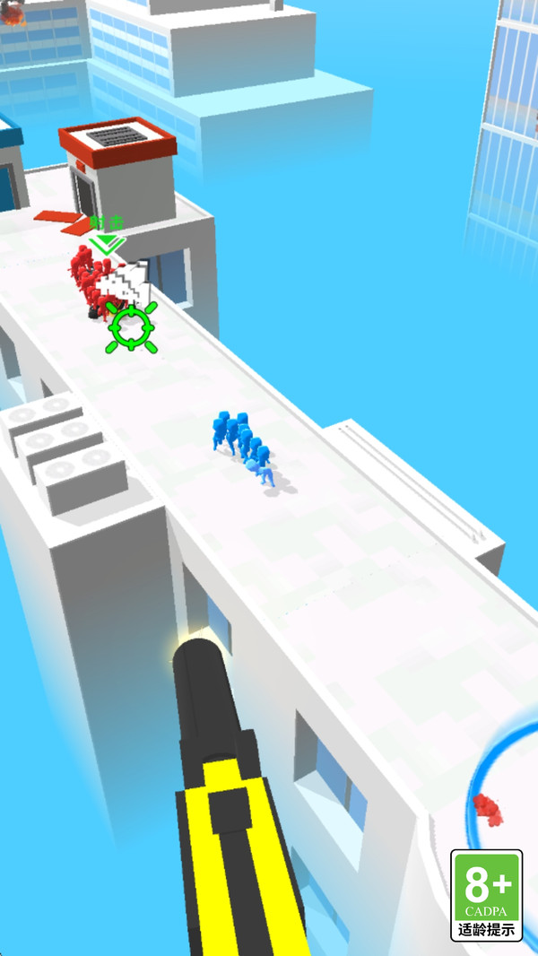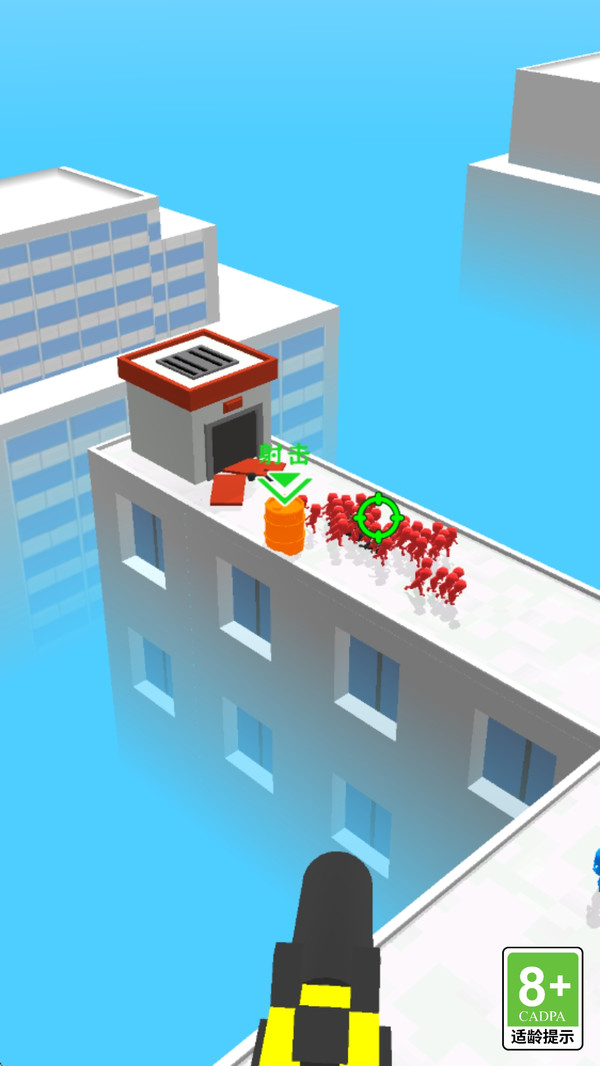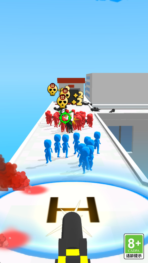 1、通过滑动屏幕控制瞄准射击,击杀追捕的敌人火柴人,保护己方人员登上直升机。