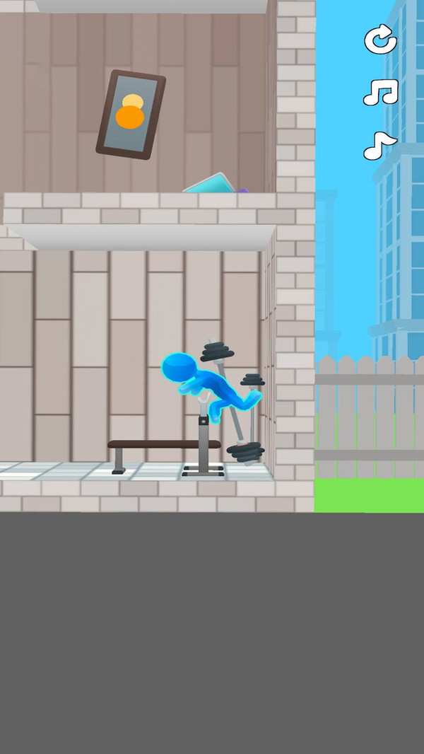 2、游戏难度逐步的升级,灵活的调整好小人所在位置的角度,成功的从二楼降落到一楼,到达指定位置。