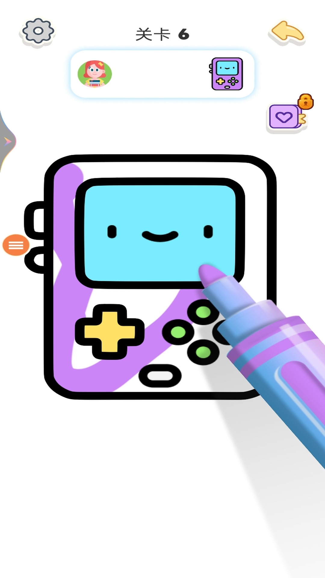 1、从第一关开始绘制,拿起画笔,跟着虚线开始绘制爱心;