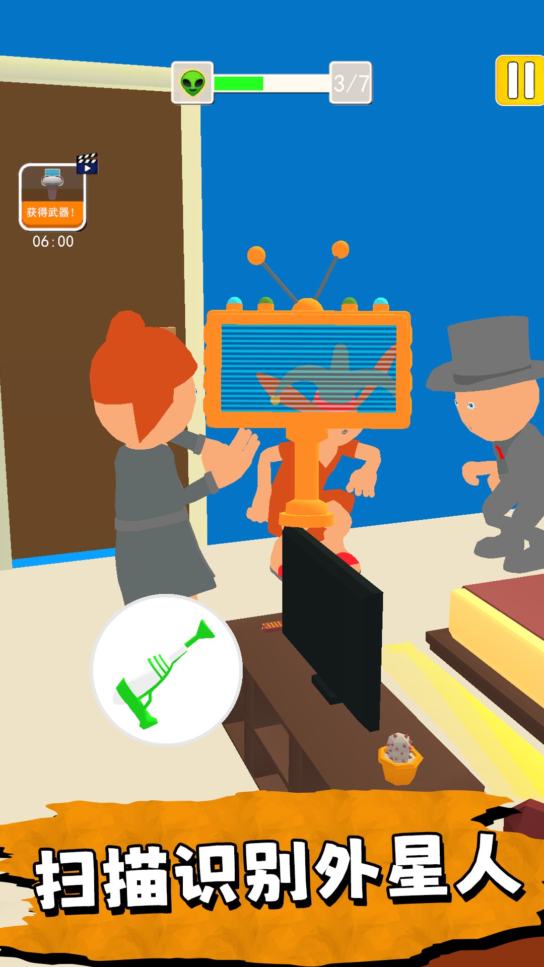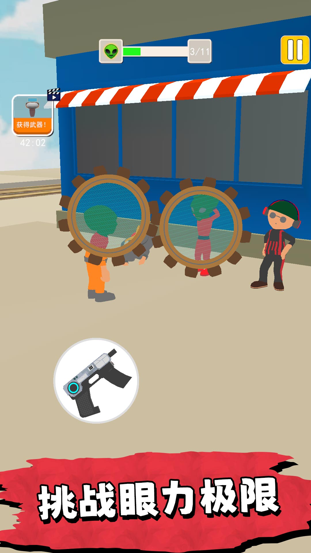 1、进入游戏,外星人来到地球上,扮演者各种角色,玩家需要利用工具找寻隐藏在生活中的外星人。