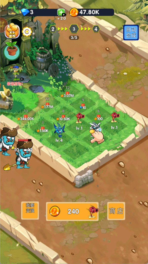 1、玩家可以在地图的草地上进行植物的种植,利用现有的金币,植物还可以进行合成。