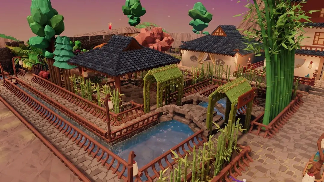 3、不止于房屋,你还可以开凿池塘、铺设青石小径、移植竹木花卉,甚至搭建一座观景亭,让你的家园与周围的国风山水融为一体。