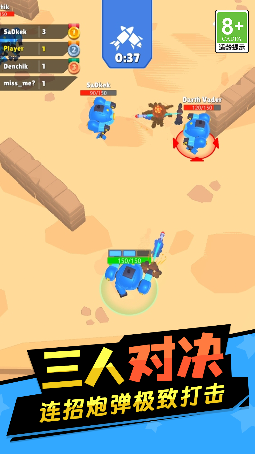 3、控制机甲继续前行,进入战场,和其他的机甲展开对战,发射炮弹消灭对手。