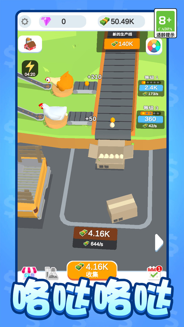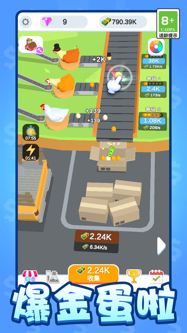 1、收集并培养不同品种小鸡,每只拥有独特产蛋效率与增益技能,如高速蛋鸡、双倍产量鸡;