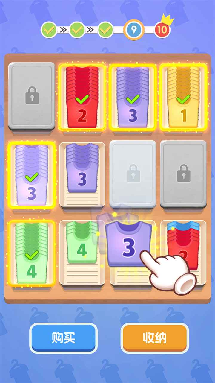 4、规则简单上手容易,点击放置相同数字的衣物,成功的消除收纳获取奖励。