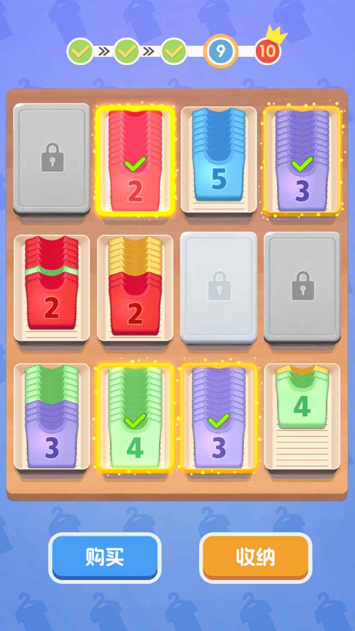 1、进入游戏,点击将相同数字的衣物放置在同一个格子,点击即可移动购买新的衣物。