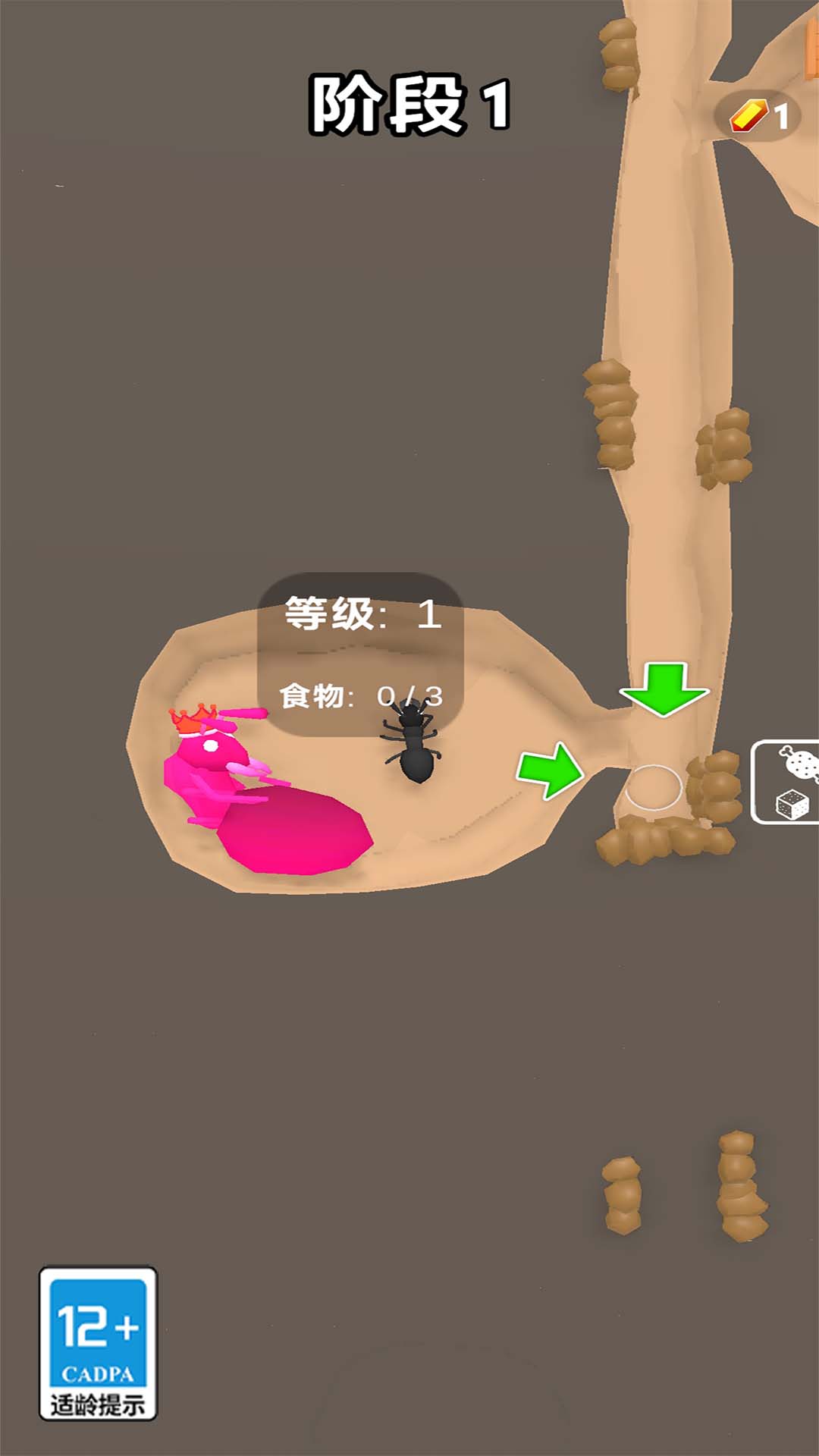 2、食物是维持族群生命和扩建巢穴的关键,你需要平衡工蚁的采集效率与兵蚁的防御需求;