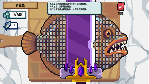 3、钓获鱼后,需在船舱内用刀具刮除鱼鳞,滑动屏幕模拟真实刮鳞过程,需避免留下红色小疙瘩,刮得越干净,鱼类售价越高。