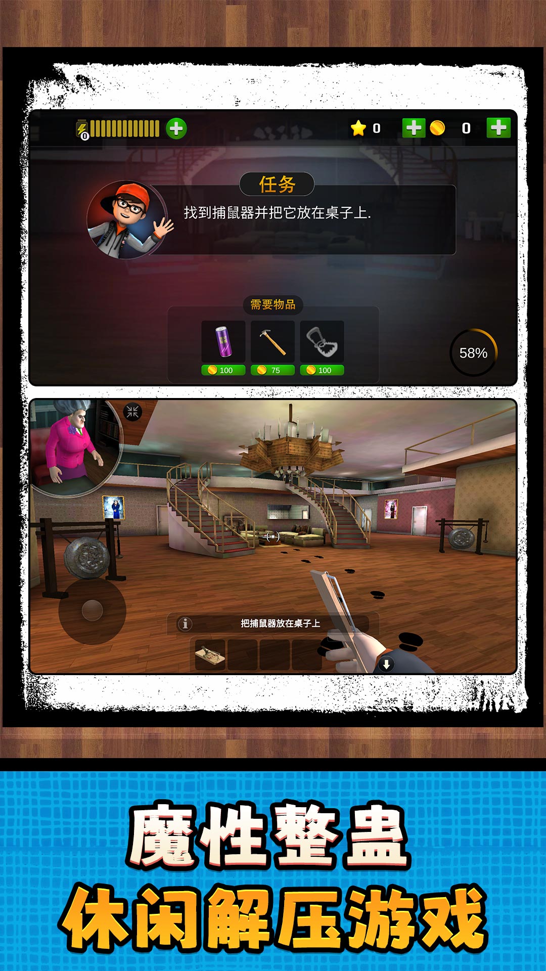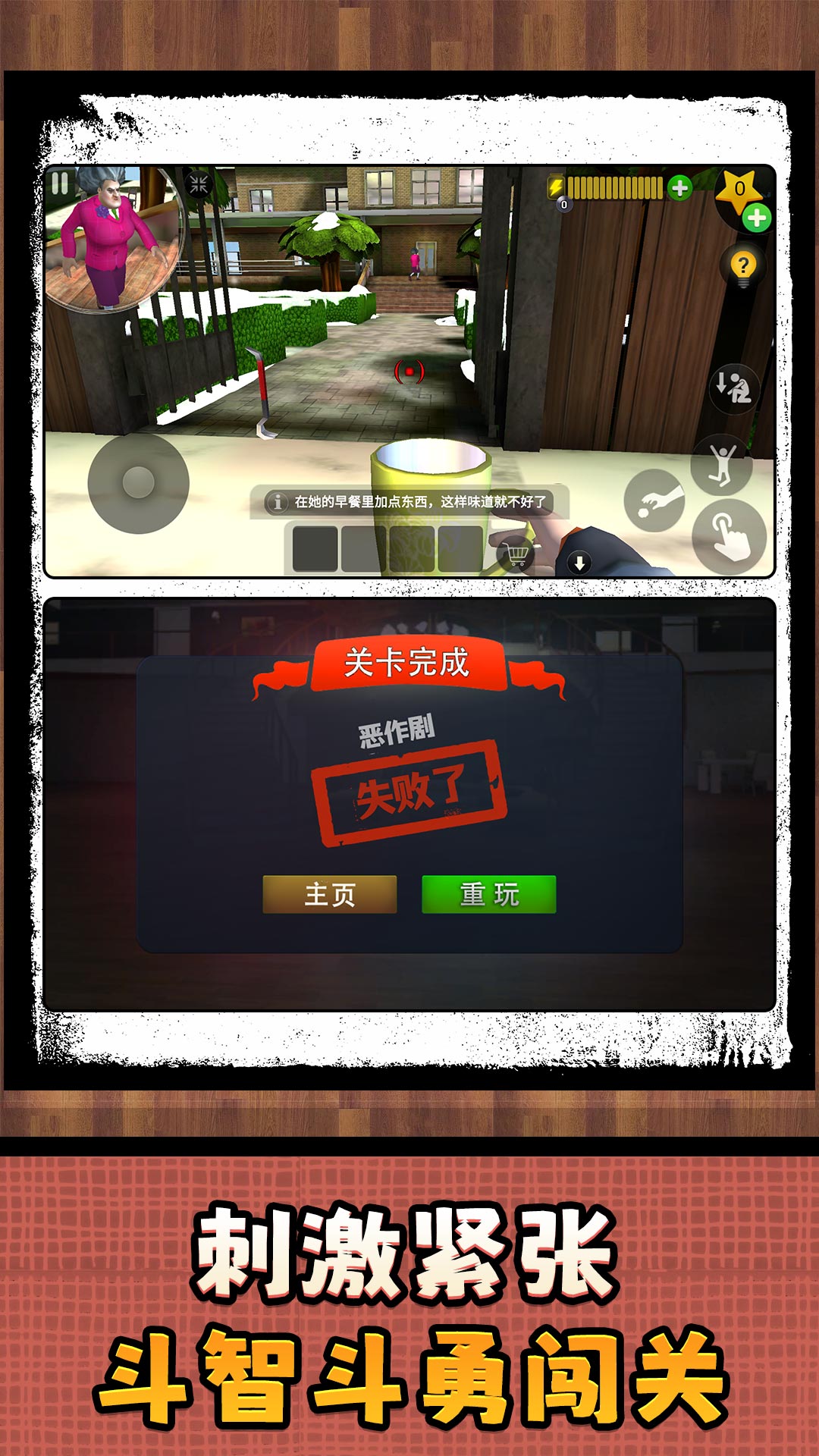 整蛊大作战是一款以反向捉弄为核心的魔性解谜游戏。你将扮演一位机智勇敢的小男孩,面对一位总是欺负小朋友的恐怖邻居,决定挺身而出,化身正义特工潜入她的家中,巧妙地利用各种无厘头的整蛊道具,来设置一场场意外,给这位邻居一个难忘的教训。游戏剧情惊险又爆笑,关卡设计脑洞大开,带你体验紧张刺激又极度解压的整蛊之旅。