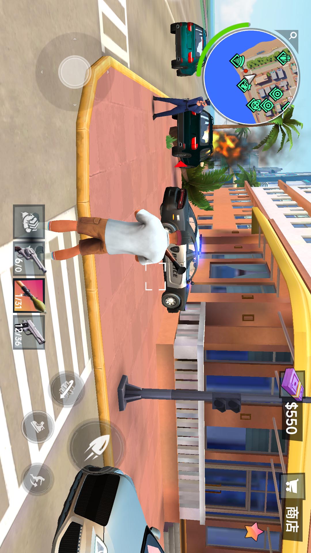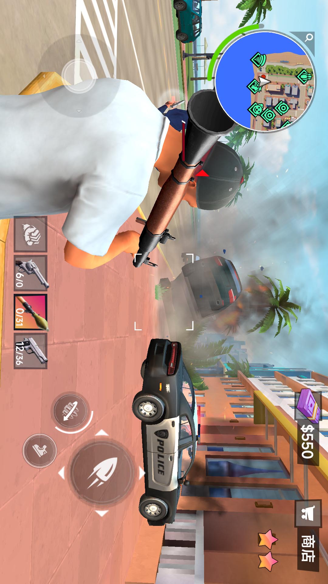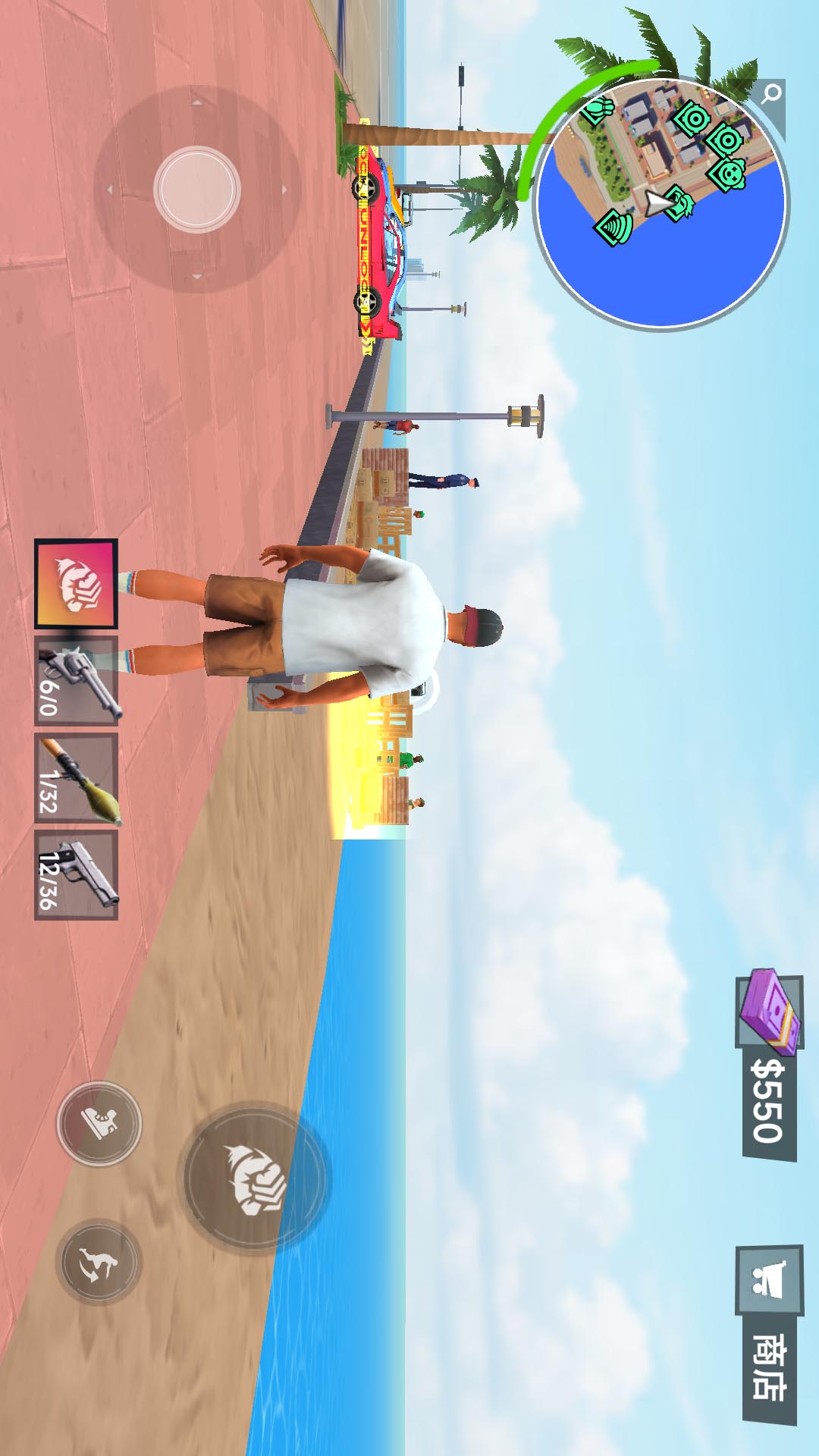1、进入游戏,控制游戏中的主角穿梭在城市中,捡取武器开始冒险,执行每关的任务。