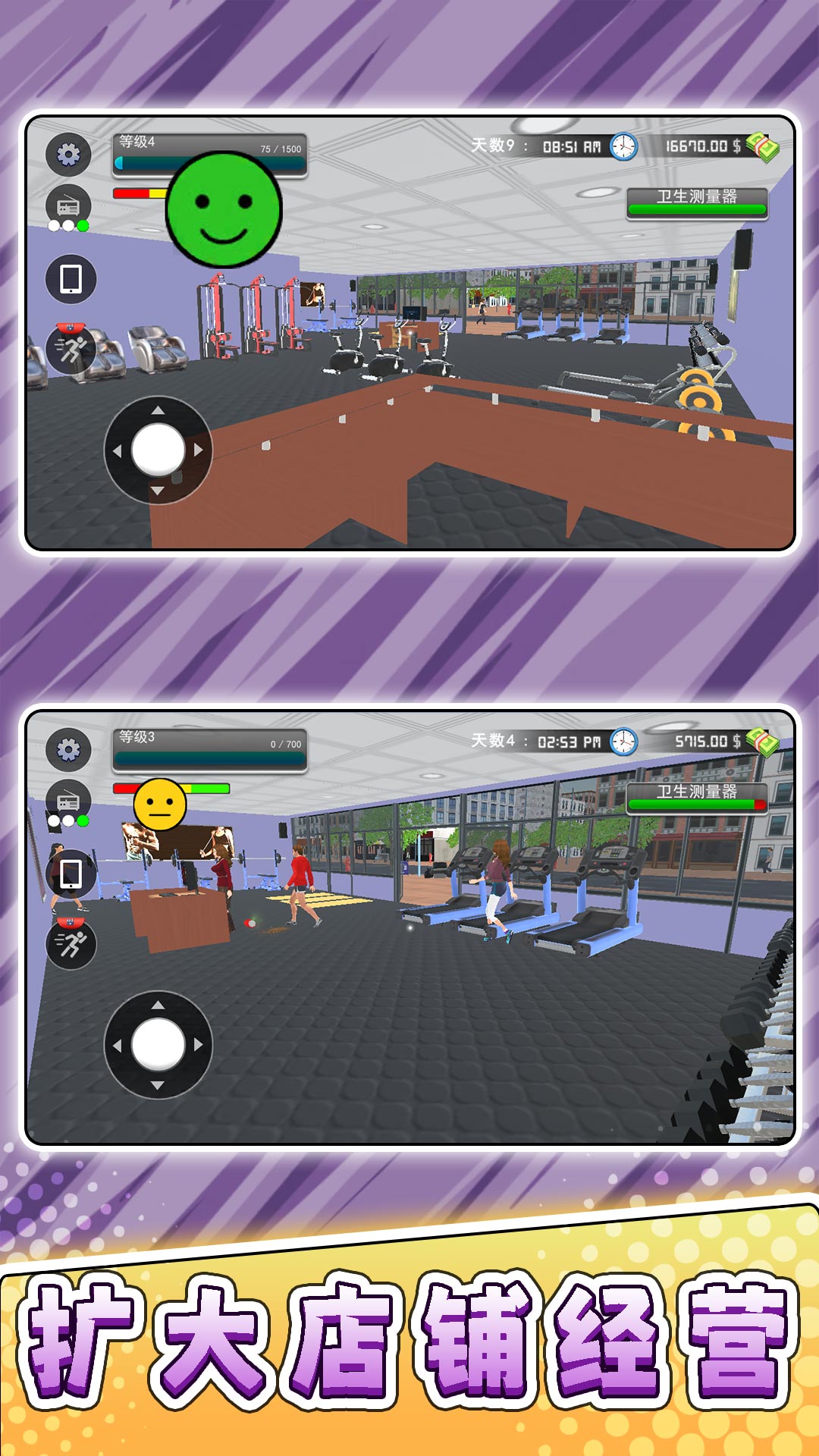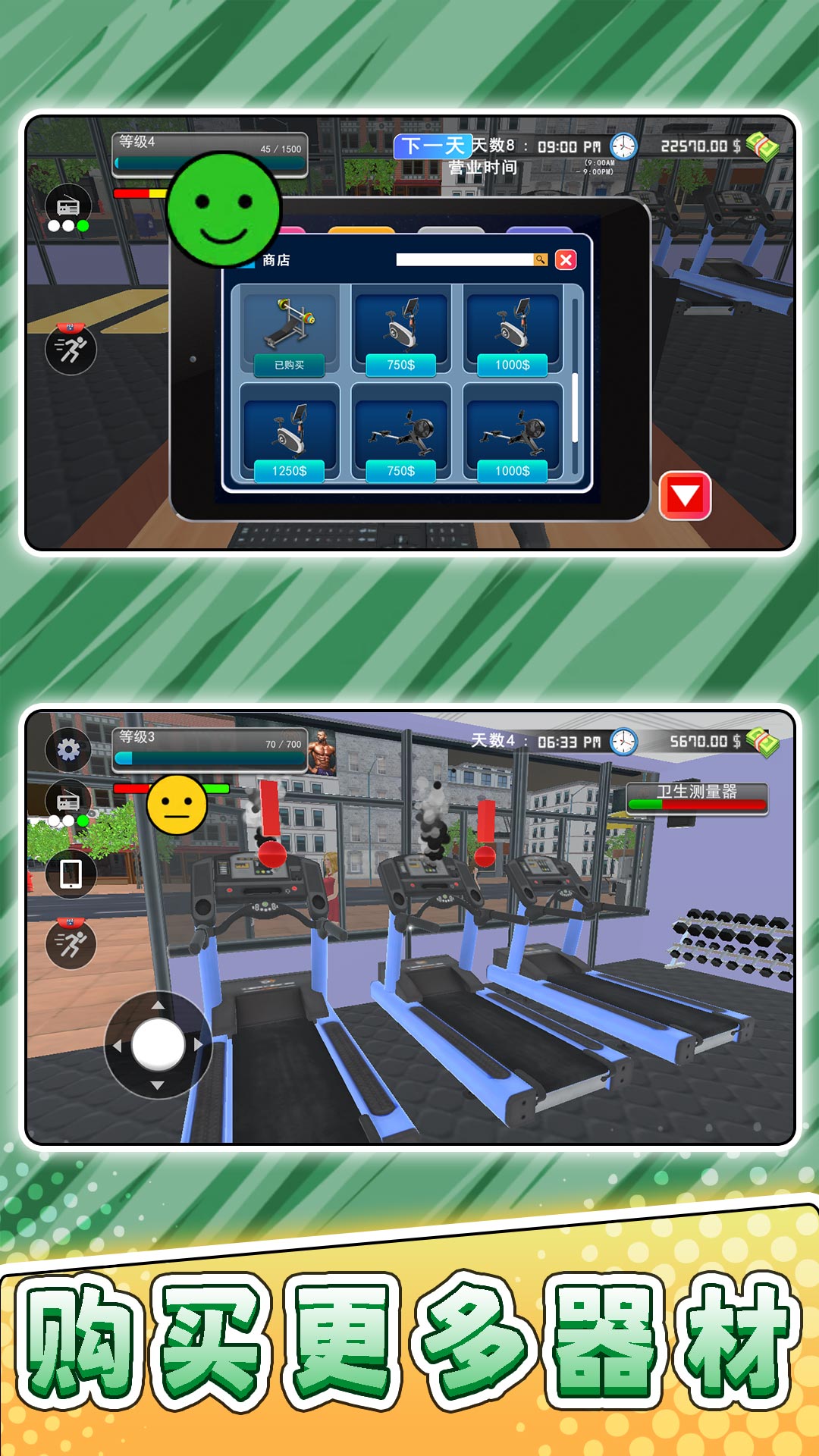 3、选择不同的角色图标,开始继续经营健身房;