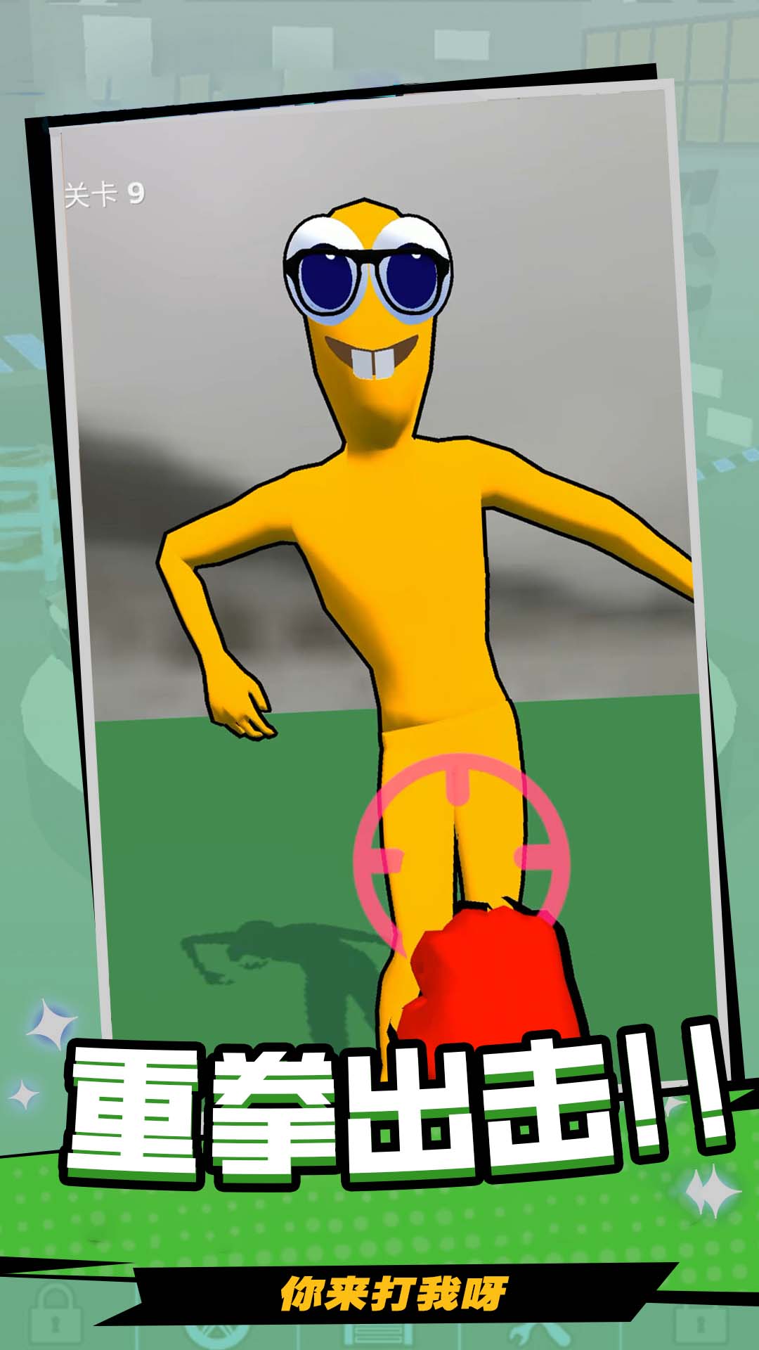 2、主角会发出哟、哟等搞怪声音,配合木偶人被击打时的夸张反应,如飞出屏幕,营造轻松诙谐的氛围;