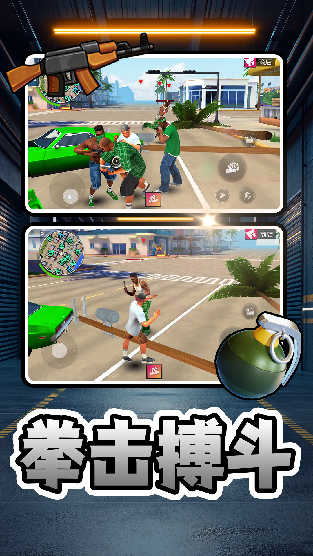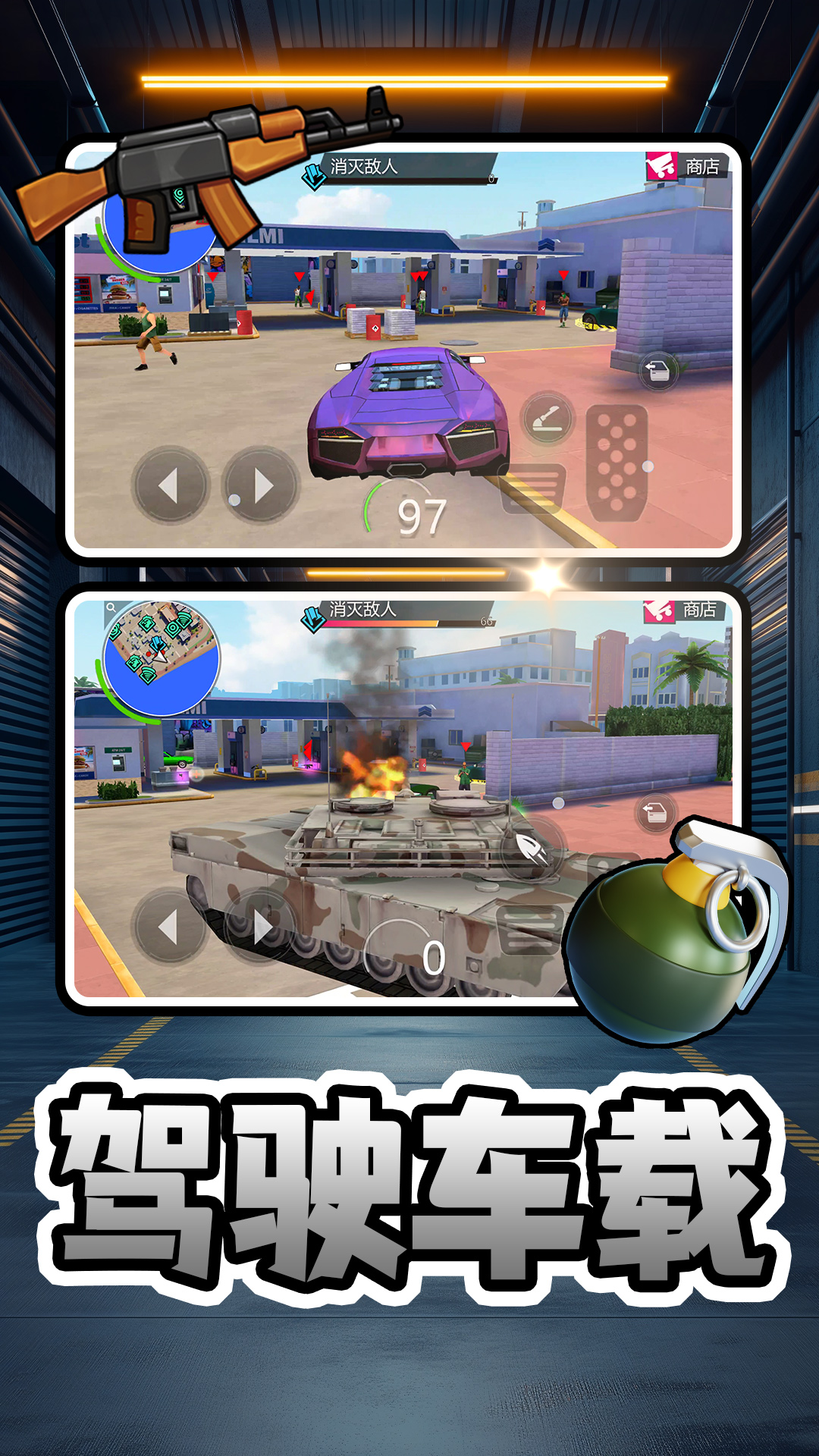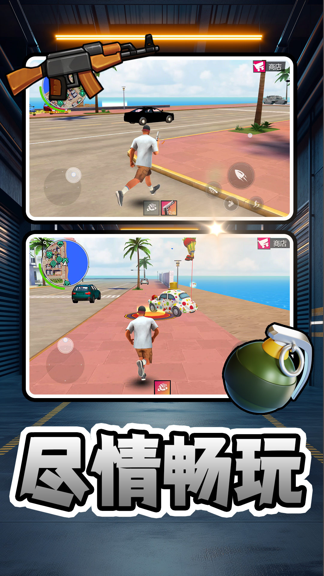 2、通过中间下方的武器道具选择,对城市中的罪犯敌人进行攻击,完成不同的任务获得奖励。