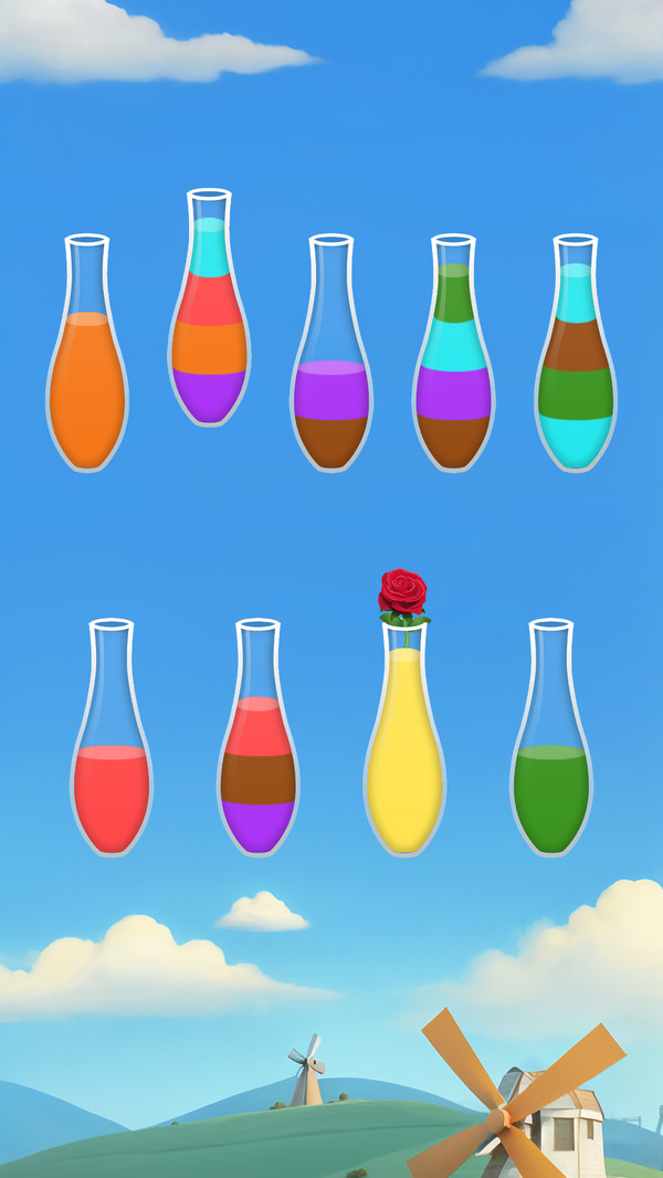 2、通过点击和倾倒操作来移动液体。只能将瓶口颜色相同的液体倒入空瓶或颜色匹配的瓶中。