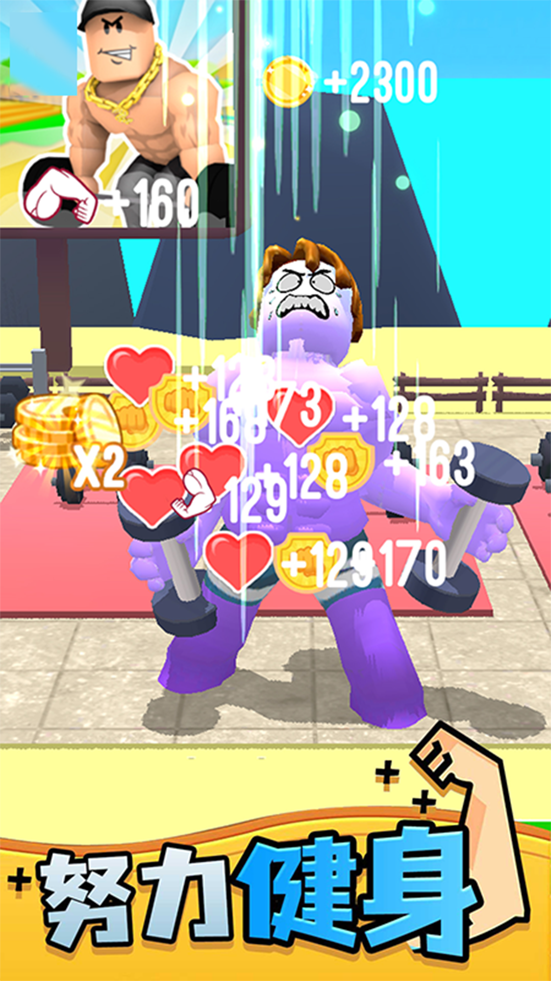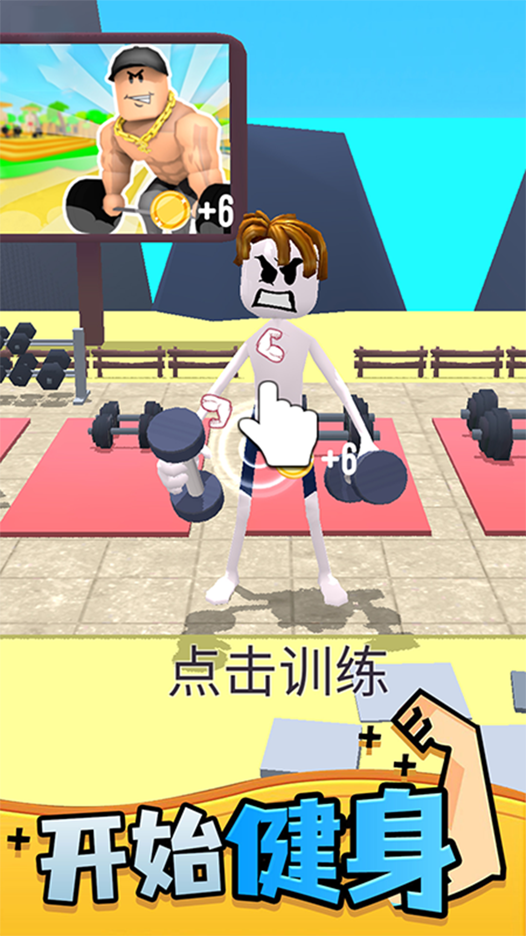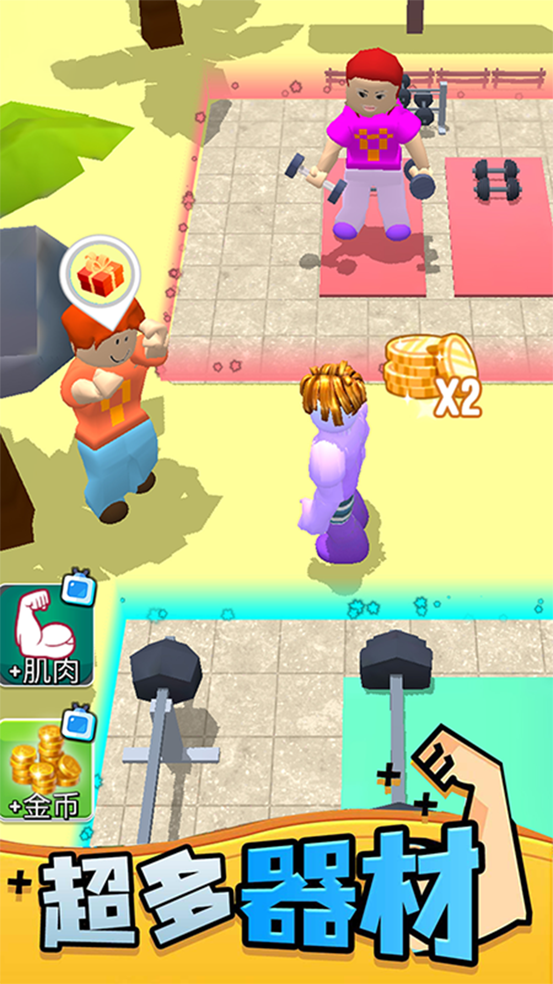 1、点击屏幕滑动控制角色在健身房移动,到不同区域训练你的身体。