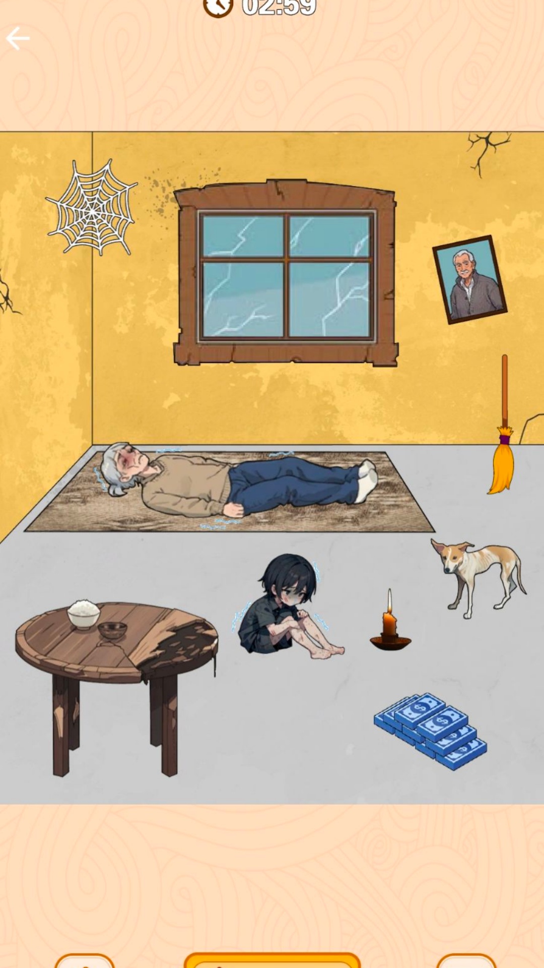 2、进入贫穷关卡,就能看到一个贫穷的家庭,用金钱去改善家庭环境吧;