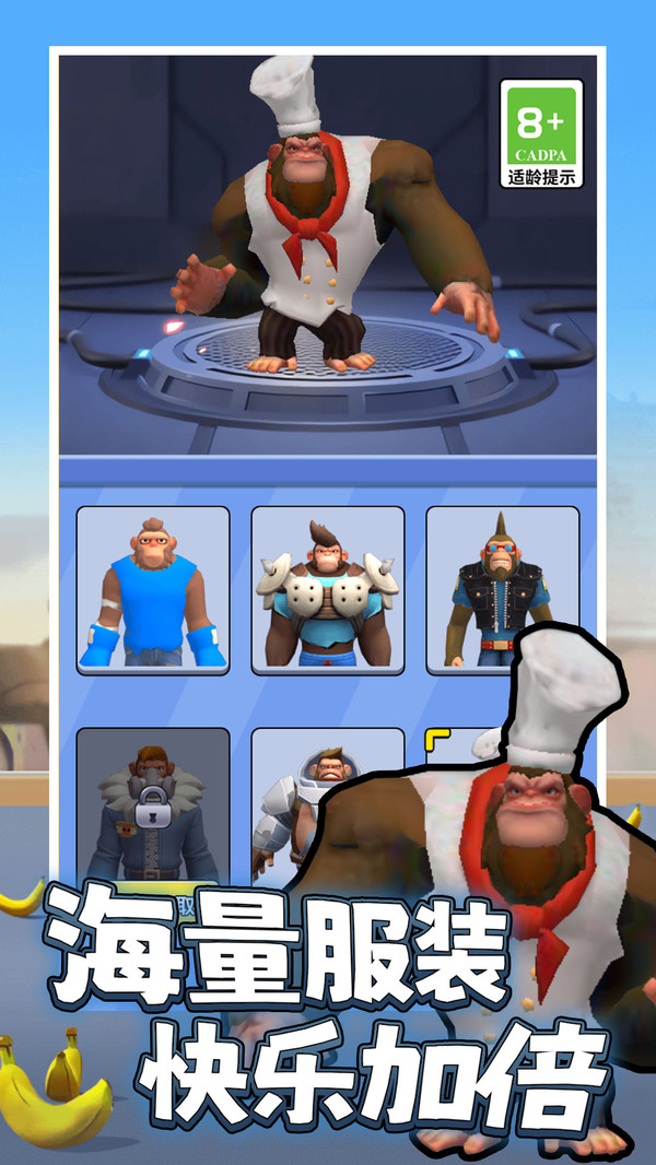 2、通过收集粮食积累能量,你的猩猩角色可以实时进化为更强大的形态。每级进化不仅改变外观,还将显著提升基础属性。
