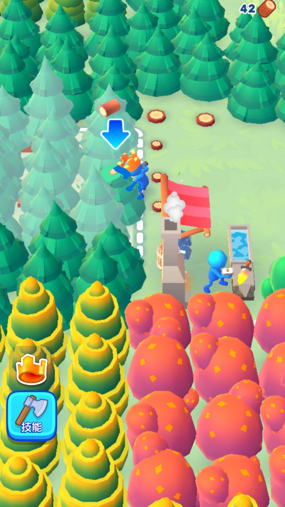 1、进入游戏,控制角色拿起斧头,利用斧头砍伐树木建造铁匠,砍伐指定的树木升级工具等级。