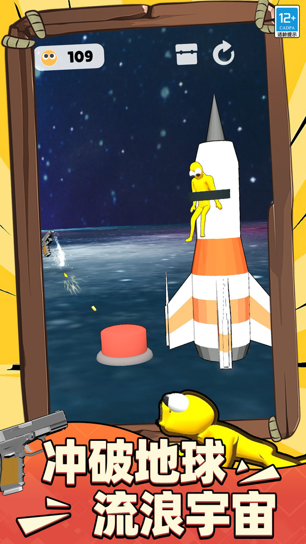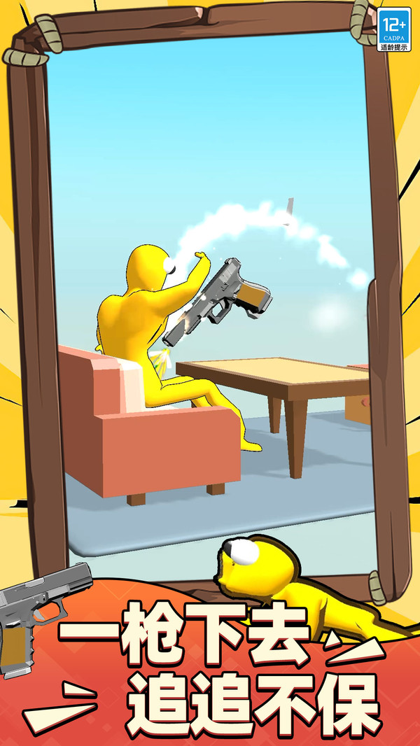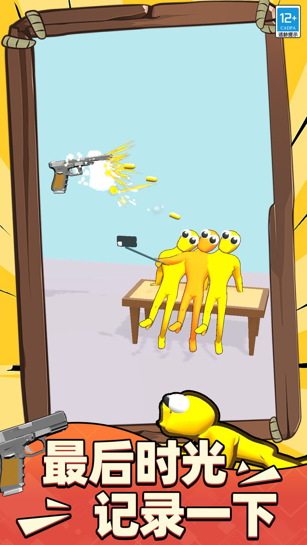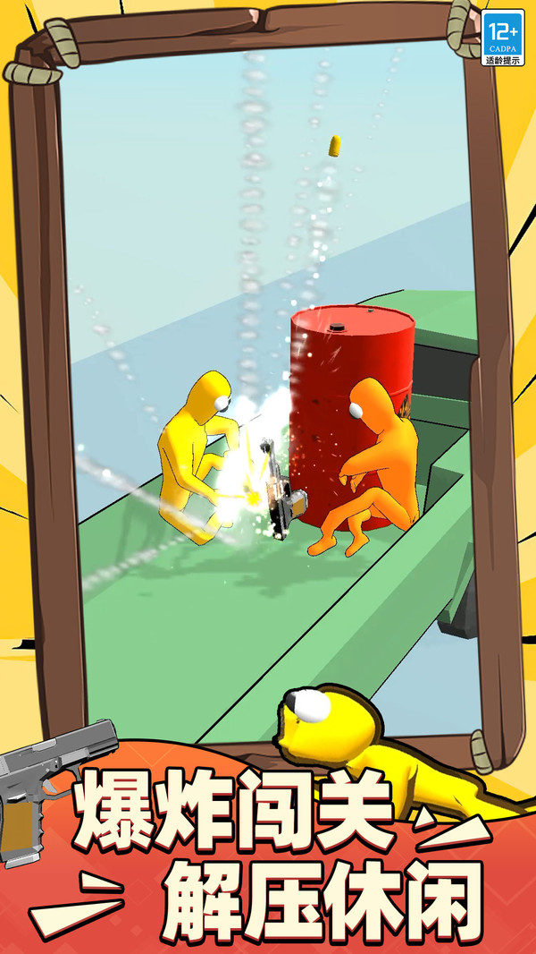 1、点击屏幕任意位置,可以让枪支进行射击,利用物理惯性射杀场中木偶。