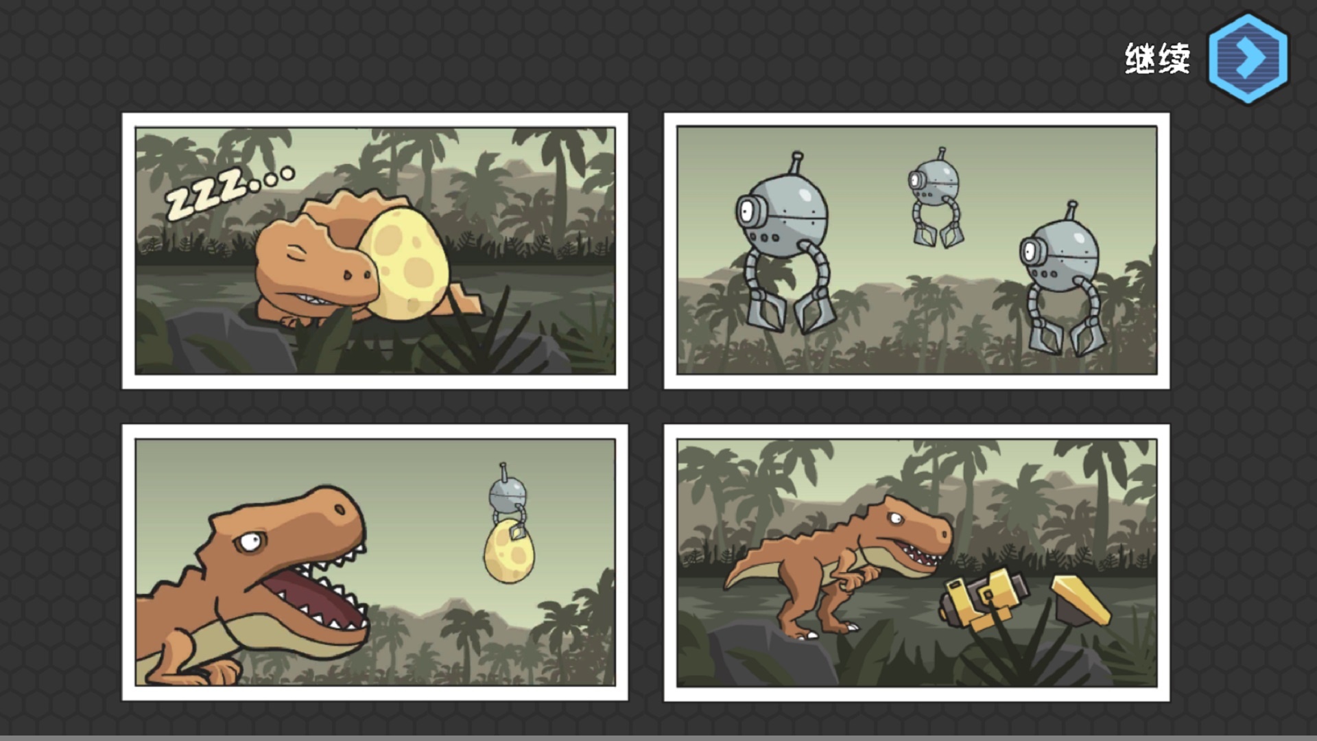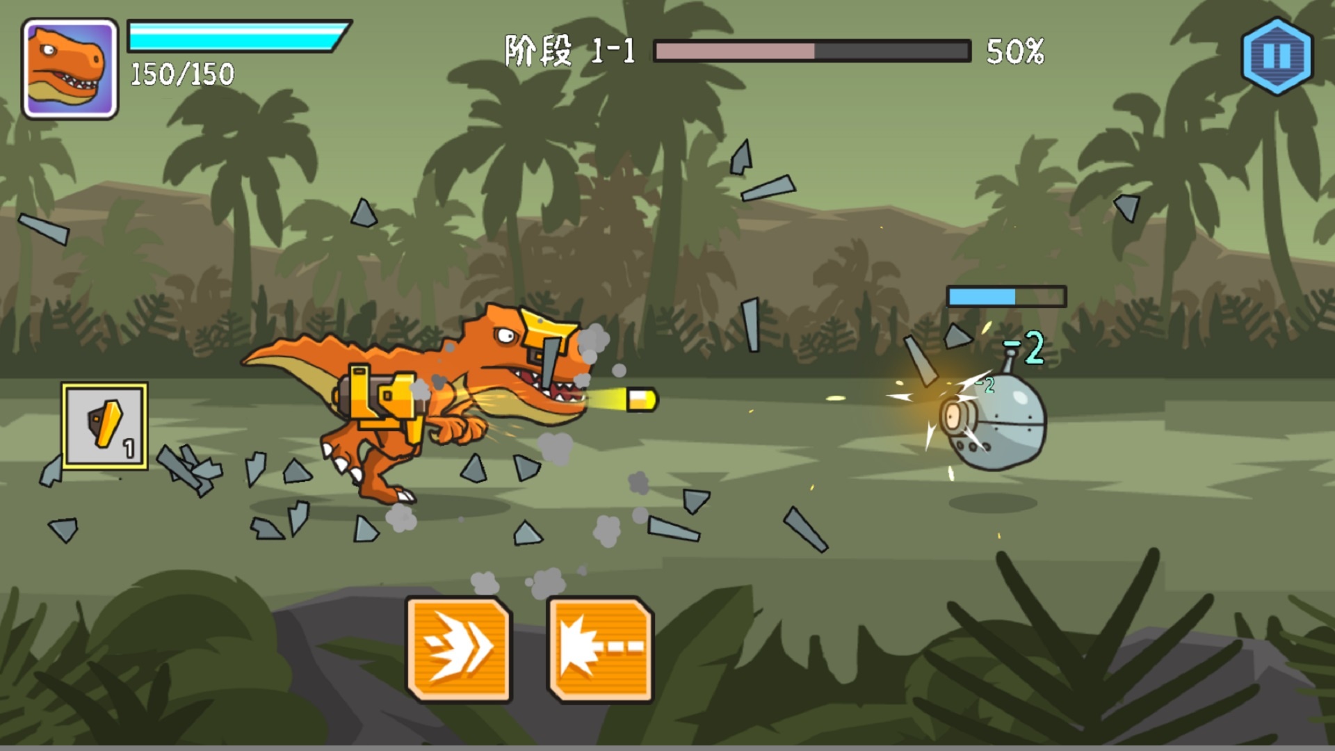 1、机甲恐龙在横向卷轴的场景中前进,机甲会自动攻击沿途出现的各种史前生物或机械敌人,直至清理完所有敌人。