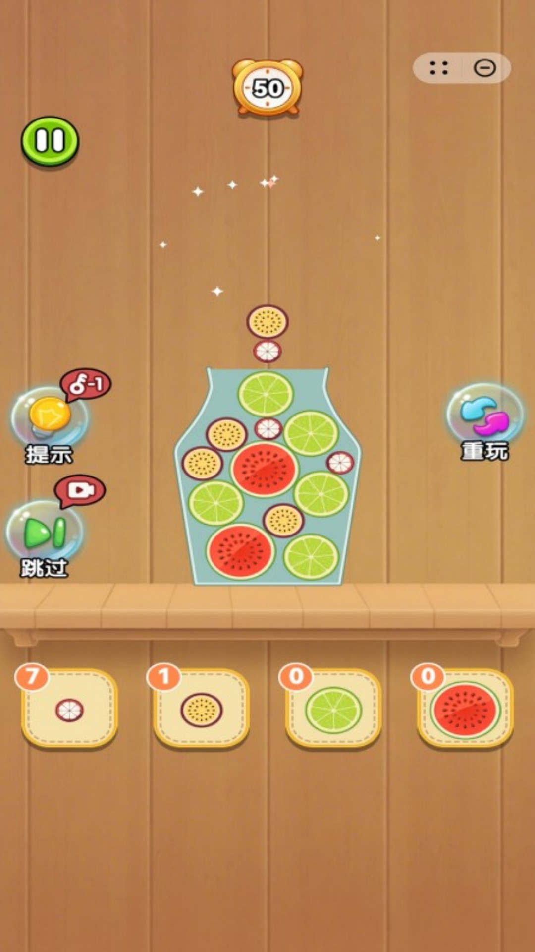 1、物理碰撞真实有趣,水果在杯中滚动、弹跳、堆叠的动态过程充满了不可预料的趣味性。