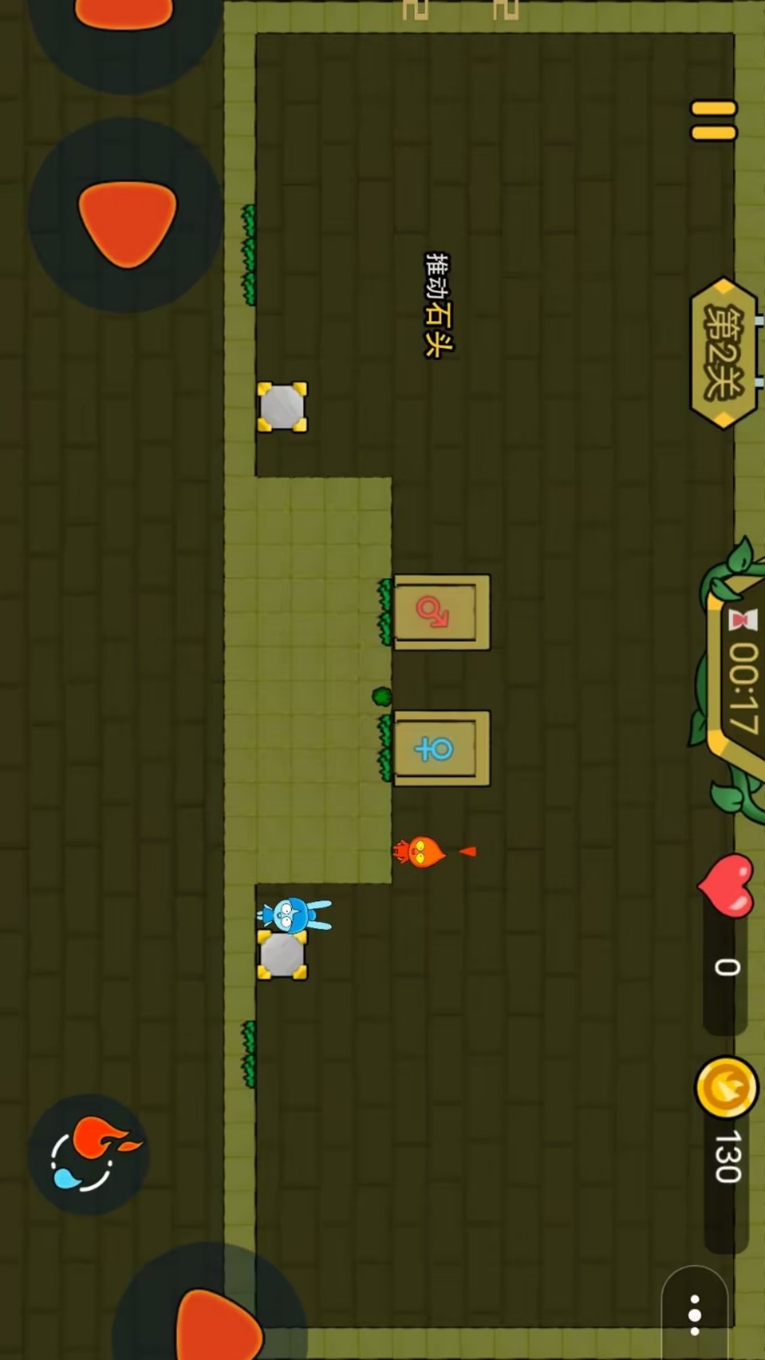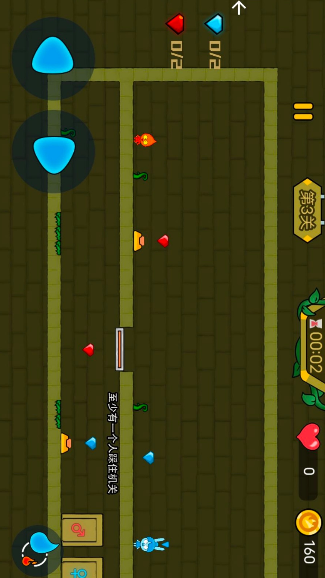 2、部分关卡需冰人冻结水面后,火人快速通过,或火人融化冰障,冰人随后搭建冰桥,完成挑战;