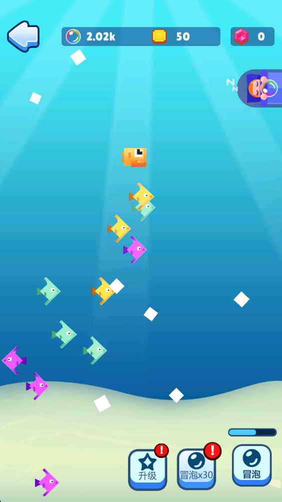 2、不断的吞噬小鱼,获取丰富的气泡,操作十分的简单有趣,积累大量的分数,解锁新的玩法。