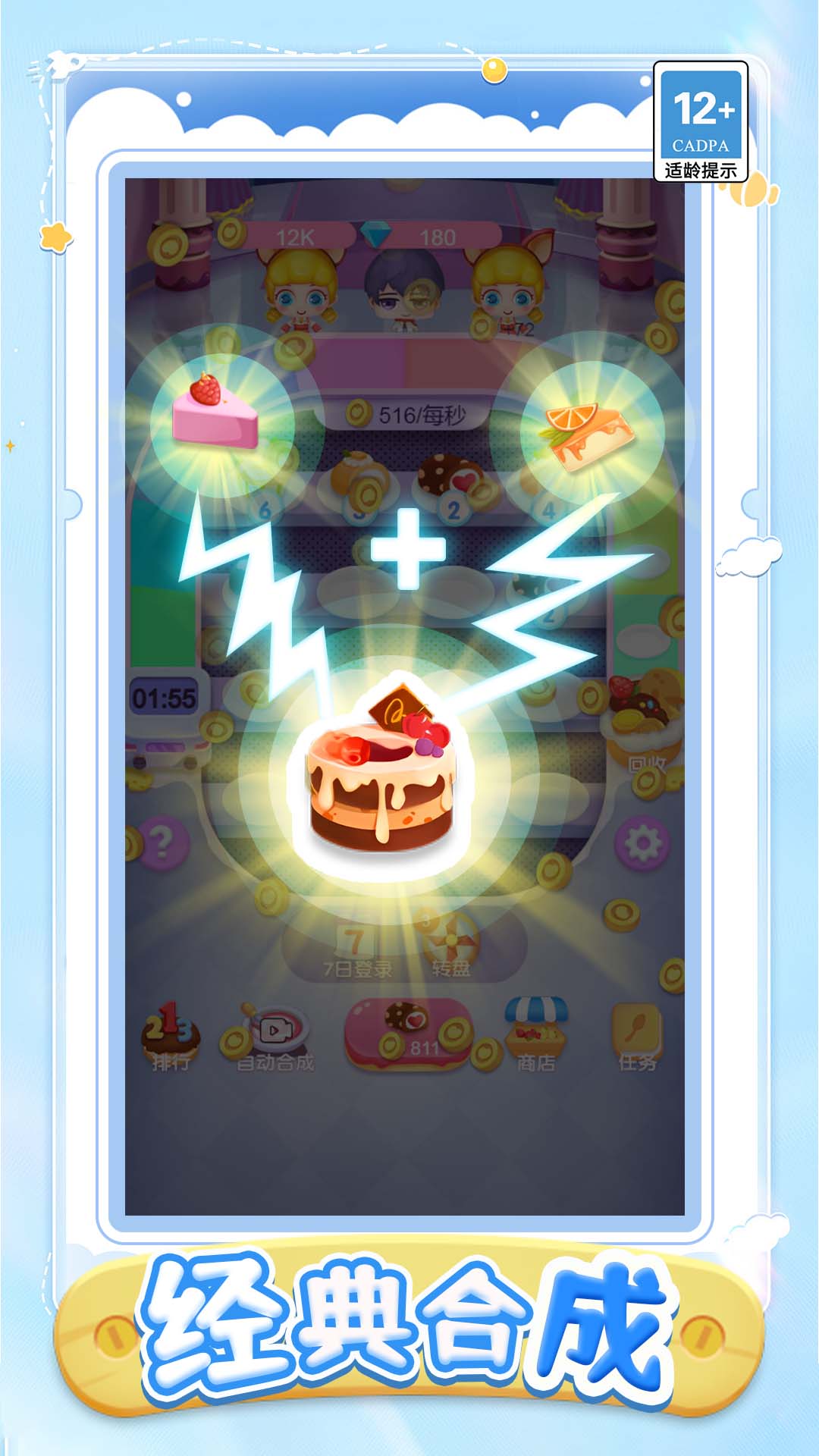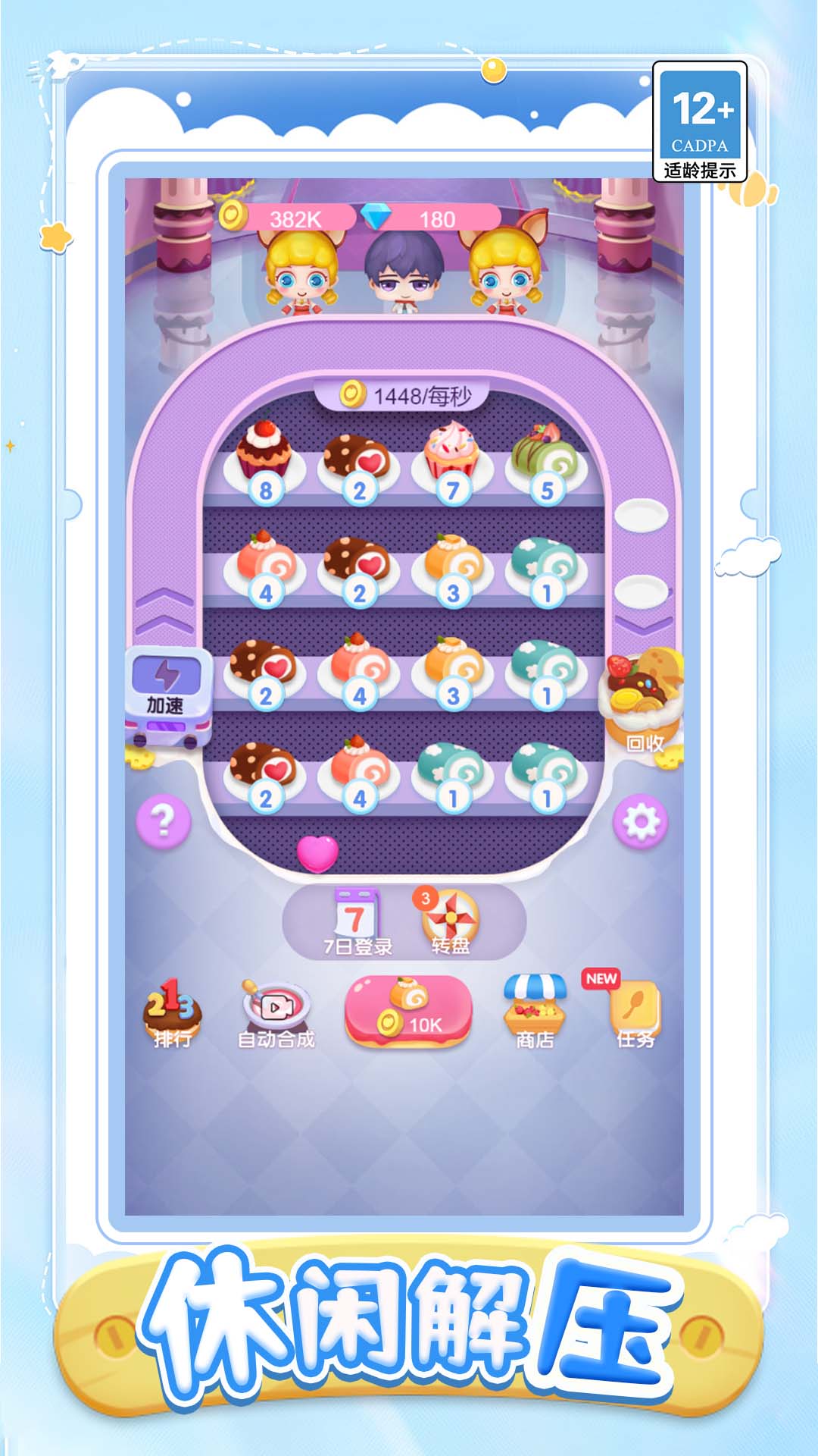 2、游戏内包含蛋糕、冰淇淋、马卡龙等数十种甜品,每种甜品需通过特定合成路径解锁,满足收集欲;