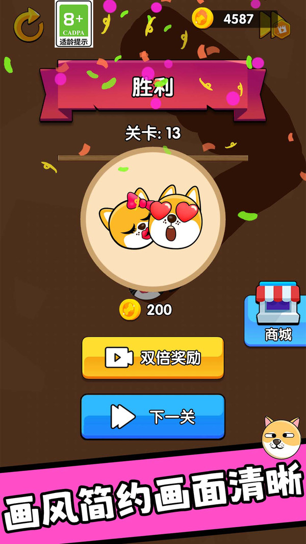 3、游戏画面简洁清新,配乐舒缓幽默,狗头角色表情生动,为益智闯关过程增添了丰富的趣味性和欢乐感。