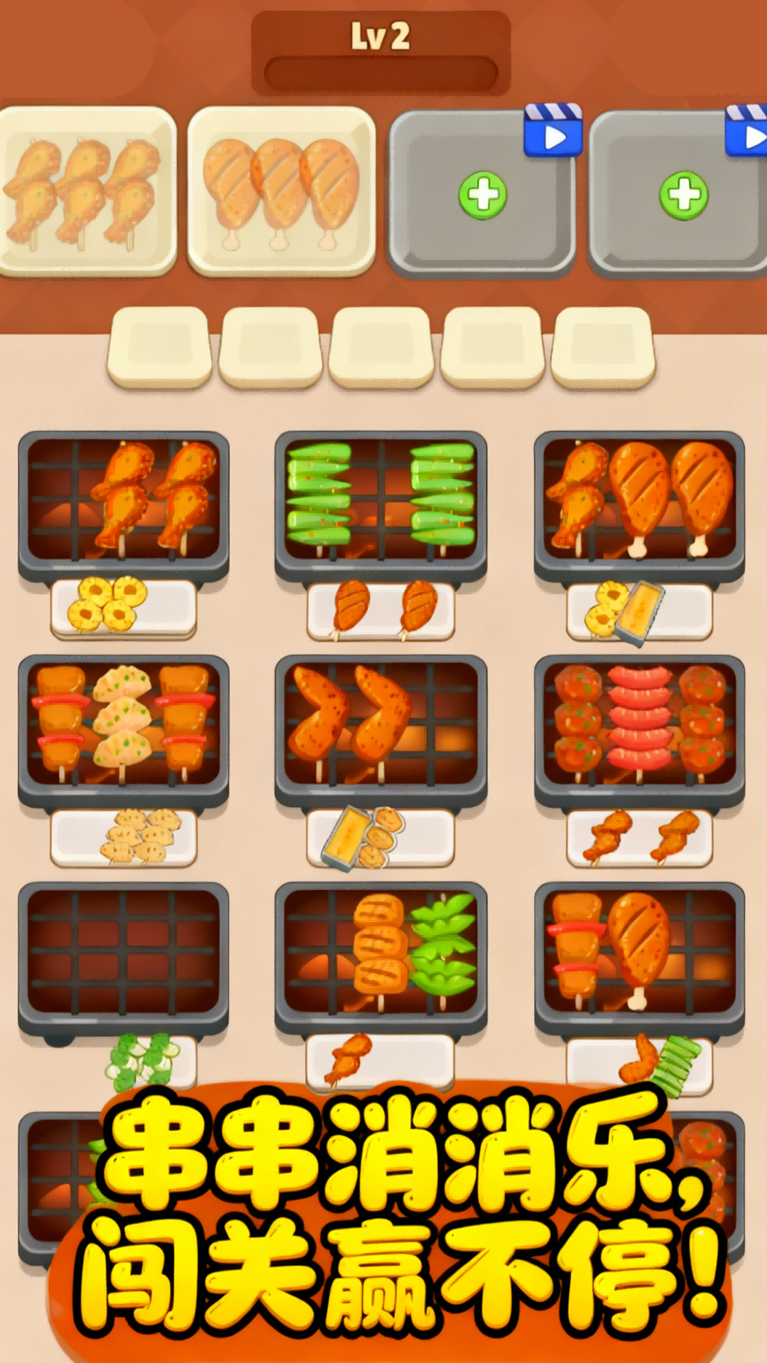 3、 随着关卡推进,会解锁更多不同食材的串串,如牛肉丸、玉米串等,增加辨识与配对的难度。