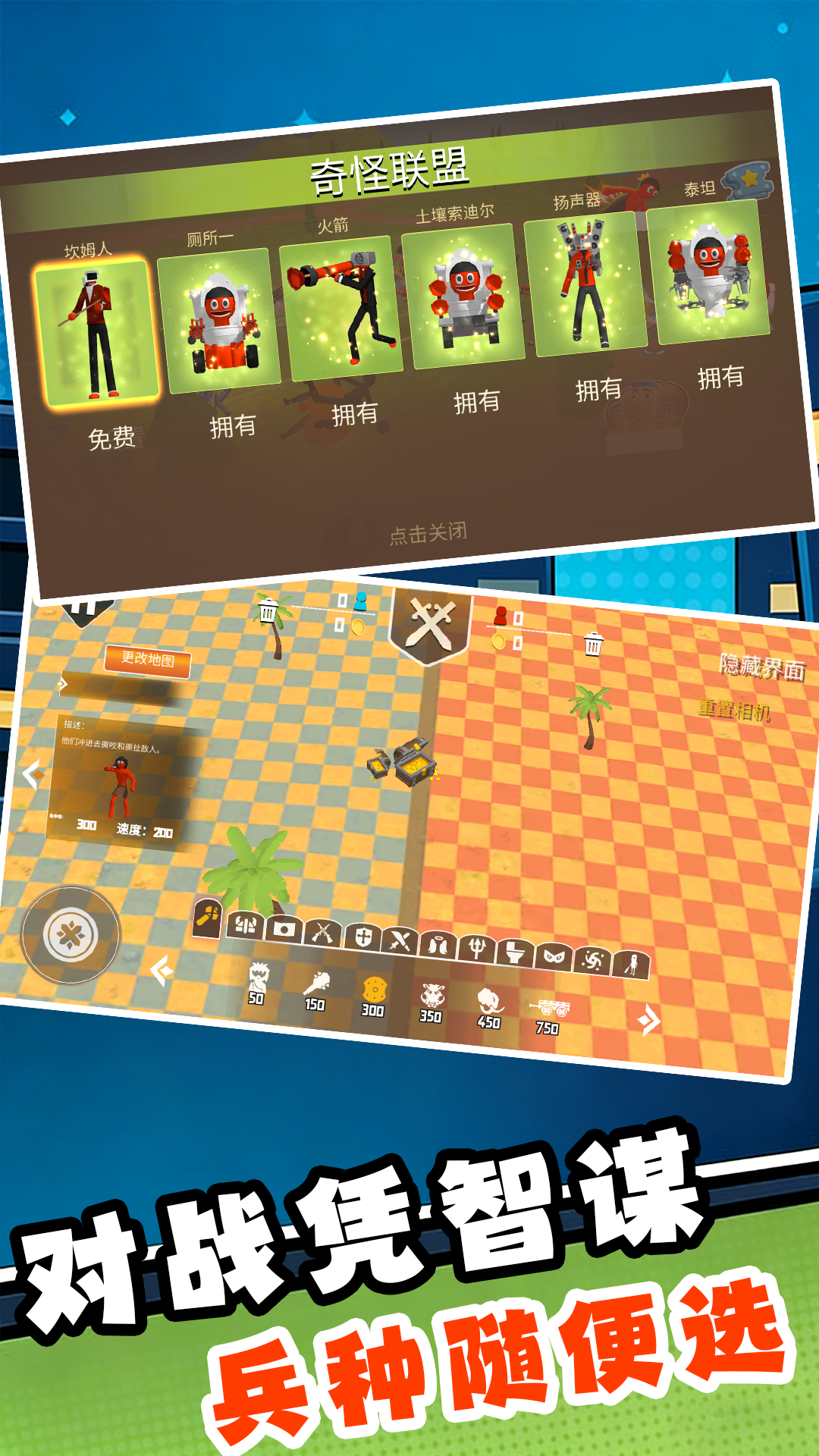 攻塔奇兵是一款高度自由的沙盒对战游戏,进入游戏开始搭配双方的阵容,人海战术自由的对战,多种地图供你选择,制定详细的策略自由的对战,在瞬息万变的沙盒战场上,训练并指挥独一无二的士兵军团,制定攻防策略,向敌方坚固的防御塔发起致命的攻击,夺取胜利,升级防御等级,抵御敌人的攻击,展开一场充满智慧的微观战争冒险。