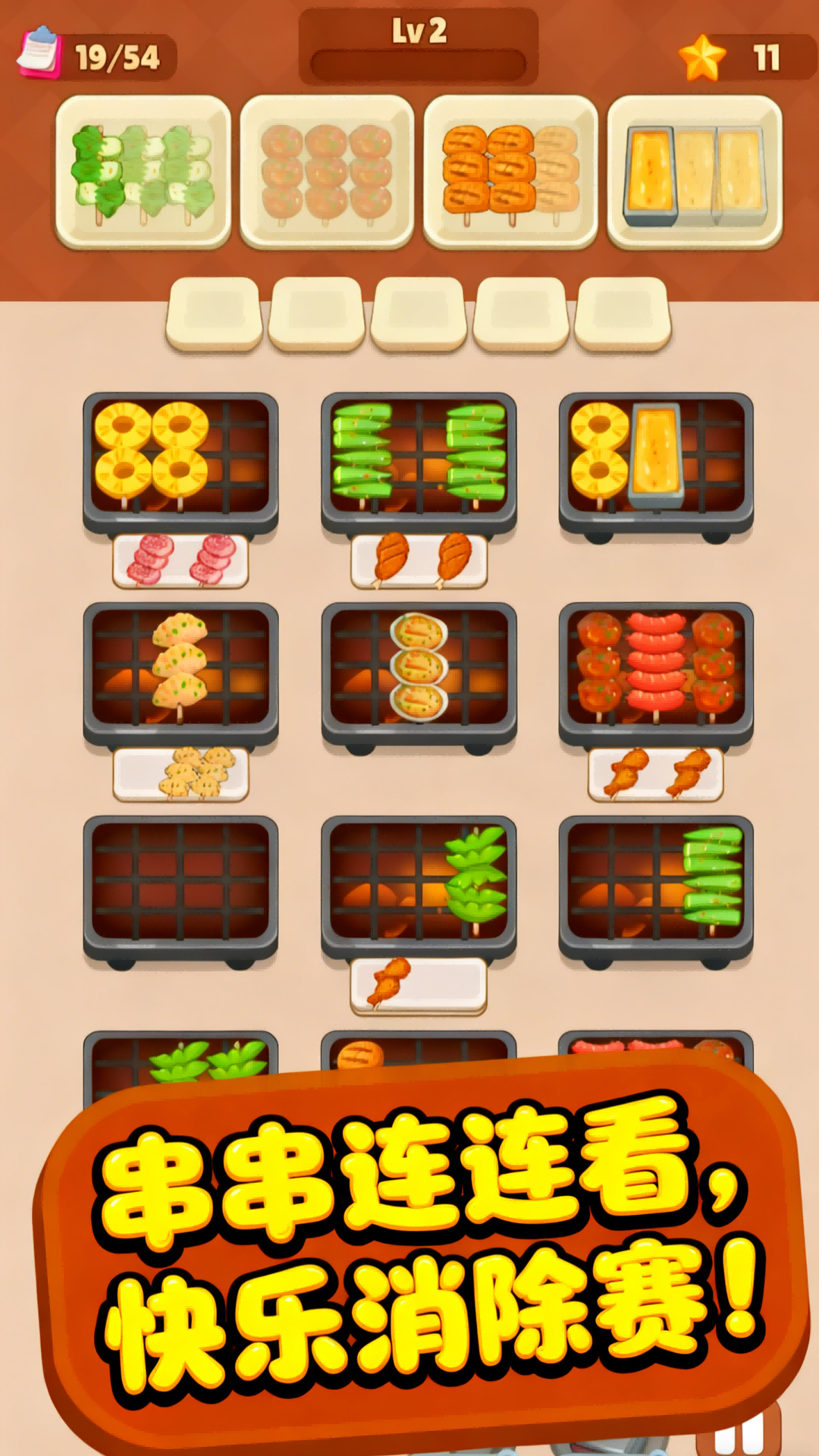 2、你的目标是通过交换相邻方块,将三个或以上同种食材连成一线进行消除,而消除的过程,即被视为烤熟或串好;
