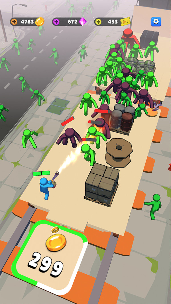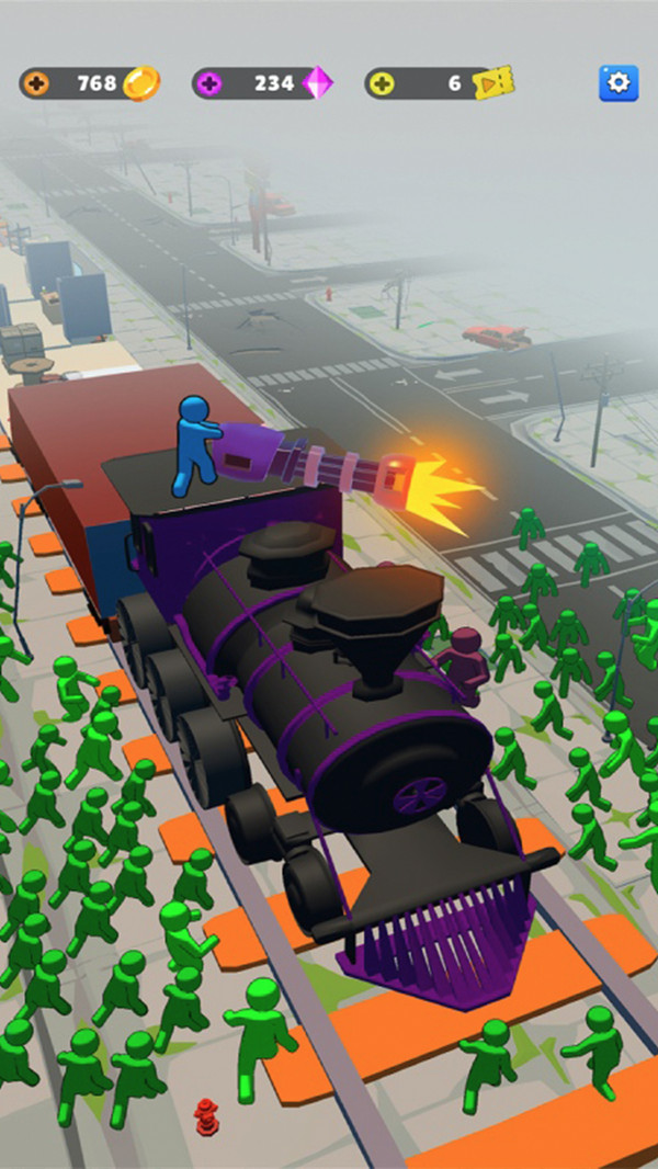 1、点击屏幕滑动控制角色在火车上移动,自动射击前来攻击的僵尸大军。