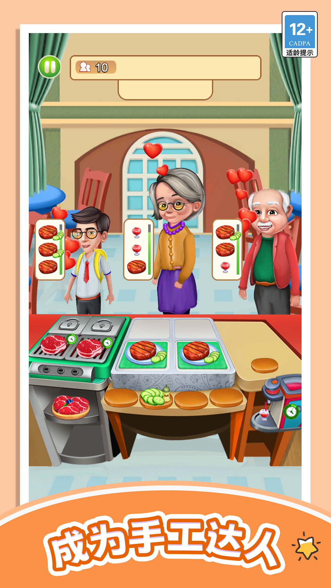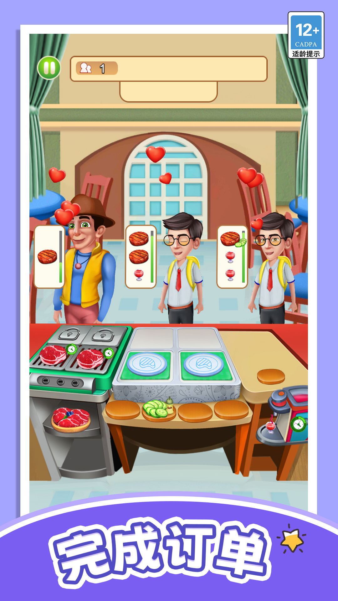 2、在趣味关卡中服务顾客,根据他们的气泡提示及时上菜,赚取金币和爱心奖励。