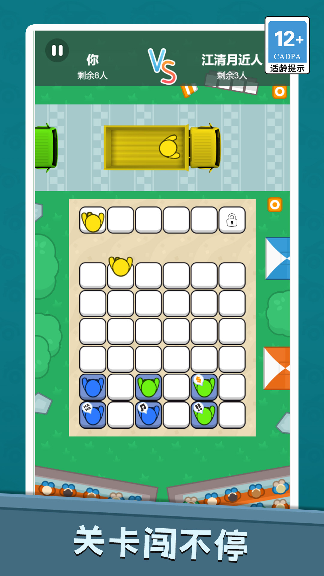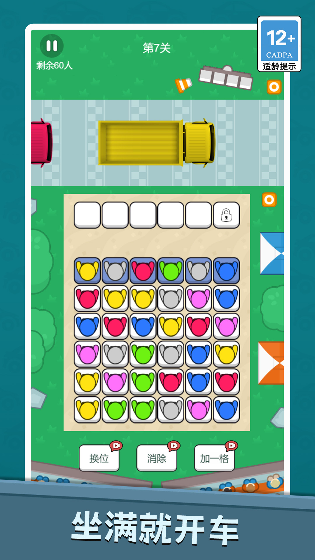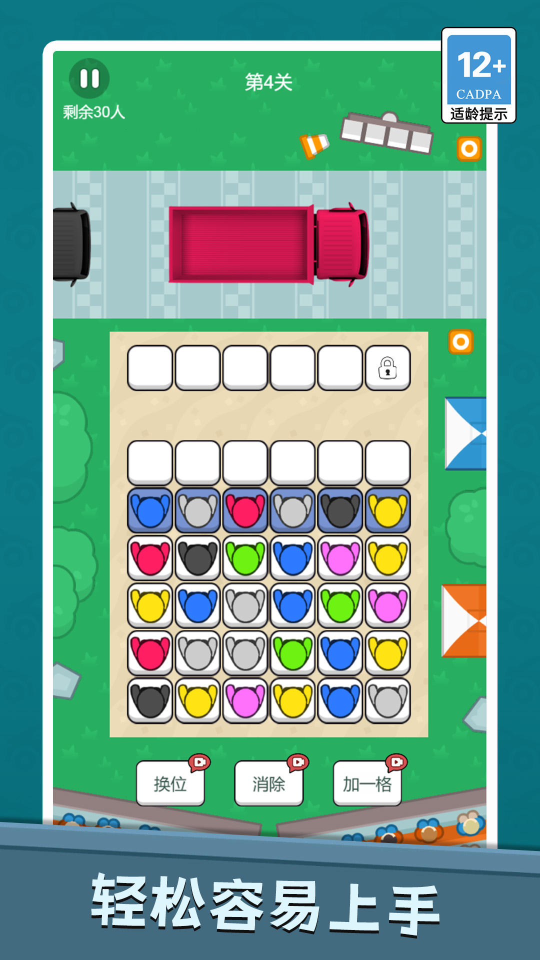 2、通过简单的拖拽、交换或滑动,调整乘客们的位置,最终形成一条完美符合所有上车规则的队伍;