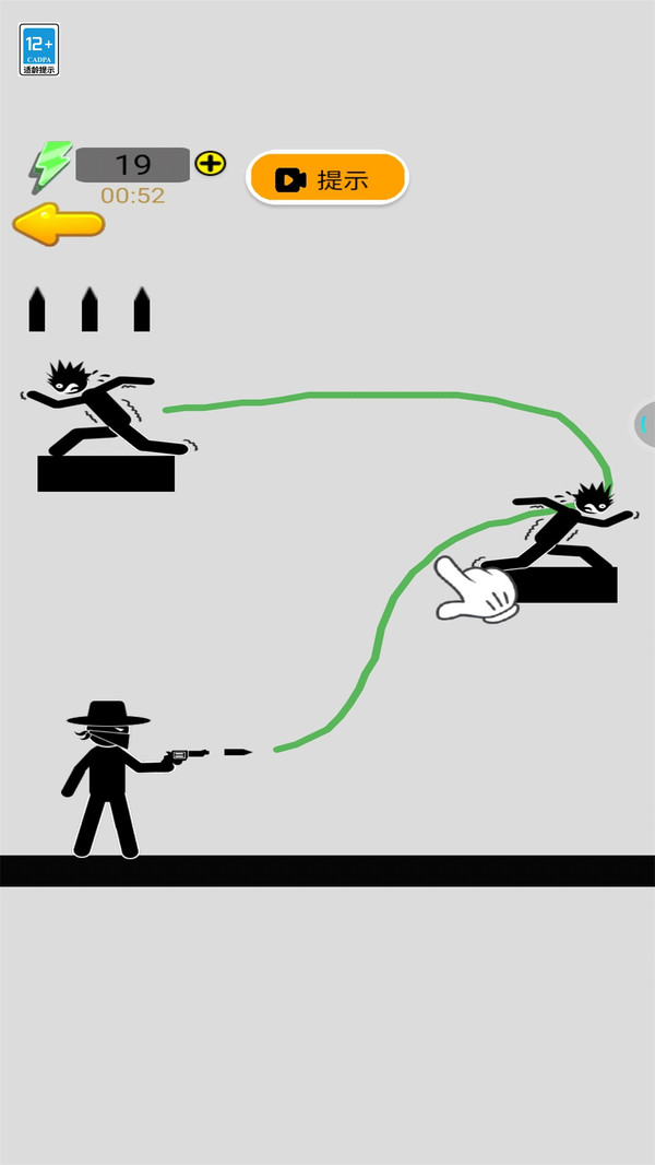 1、点击屏幕中的枪支,进行画线,绘制子弹的轨迹击杀关卡敌人。