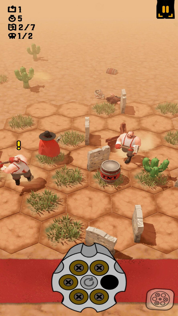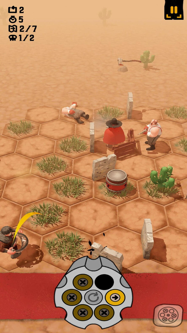 1、游戏专注于还原西部片中紧张刺激的枪手对决体验,核心玩法围绕快速拔枪、精准射击和利用掩体周旋展开。