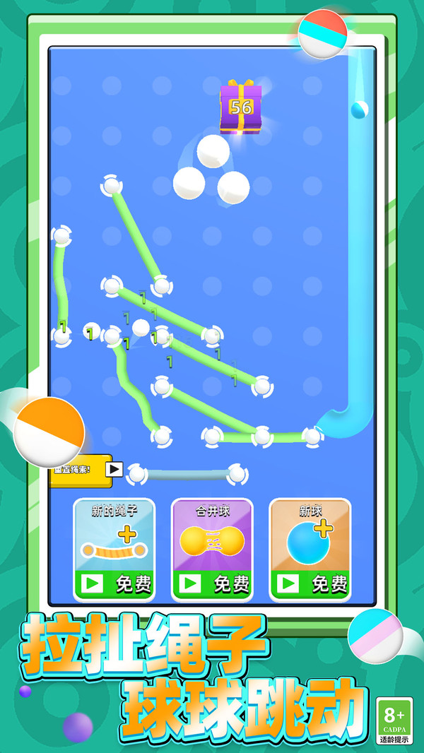 1、小球会不断的从管道中下降,在绳索上弹跳撞击获得收益。