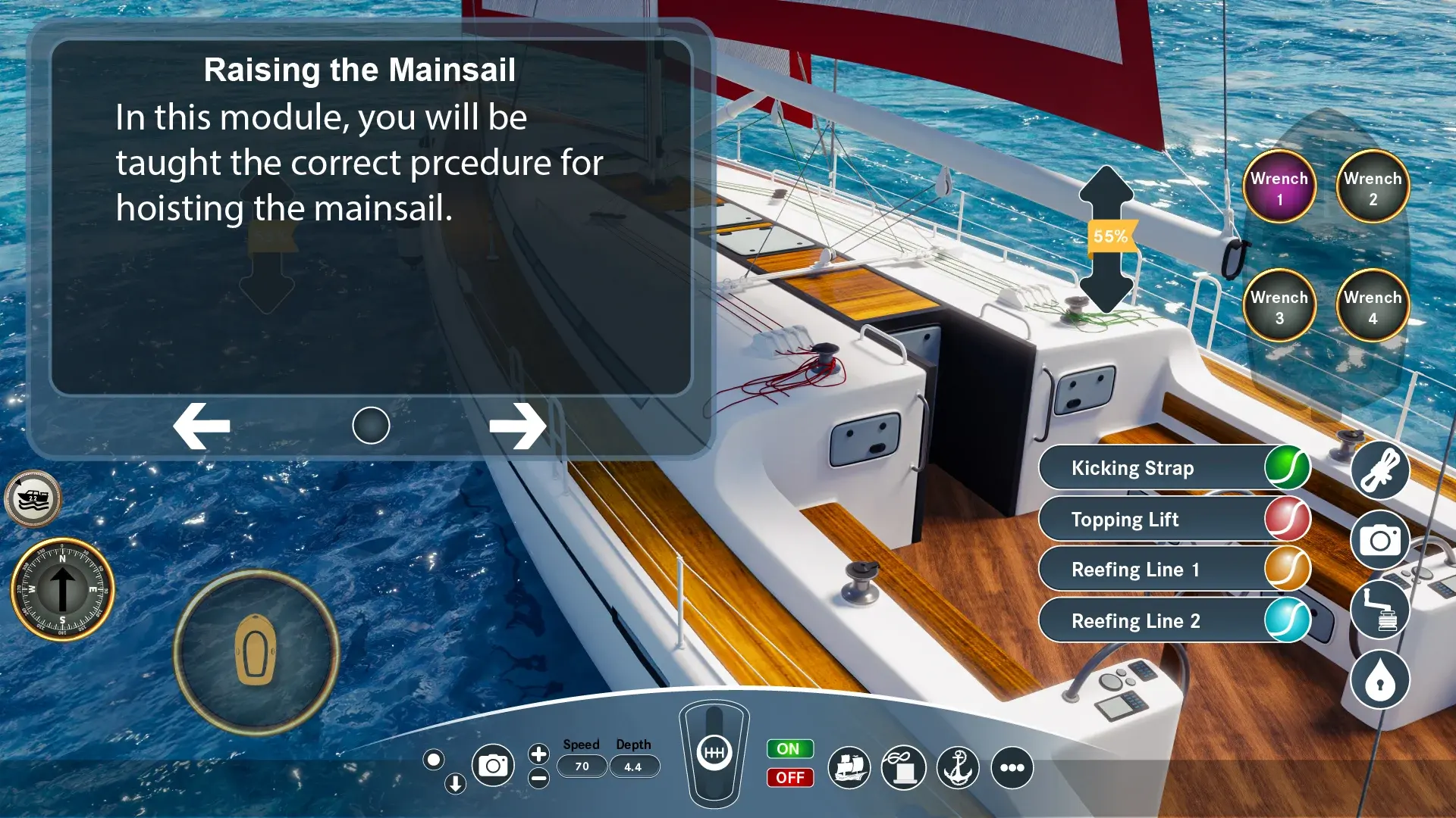1、从新手教程开始,学习识别风向标、调整帆位、执行基本转向等入门操作要领。