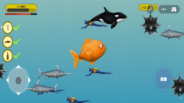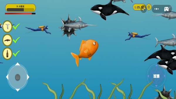 2、时刻控制小鱼自由游动,注意血量,避免血量用尽。