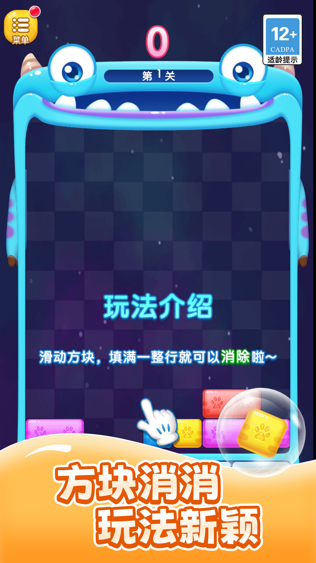 1、通过手指滑动,将方块进行快速滑动,填满一整排即可消除哦。