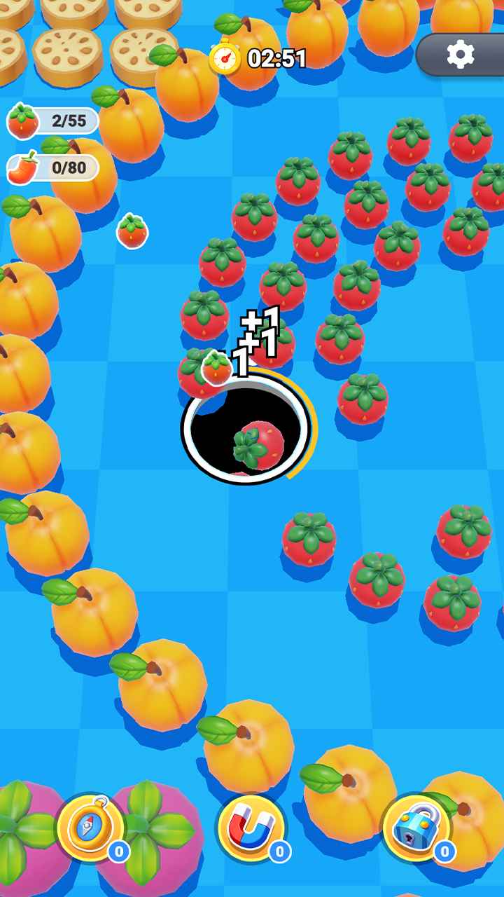 2、左右移动黑洞开始吞噬,黑洞逐步的扩大,吞噬的水果越来越多,玩法简单有趣。