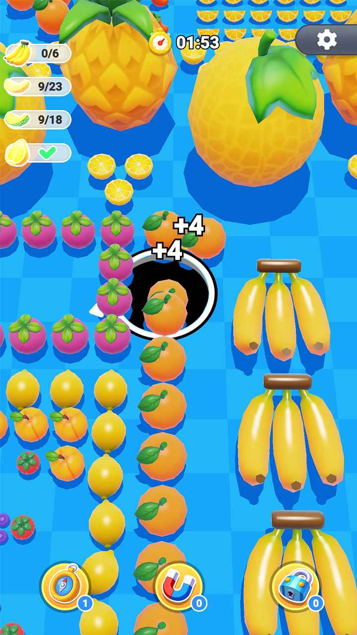 3、继续的移动,吞噬钟表即可增加时间,给予玩家更多的时间吞噬水果。
