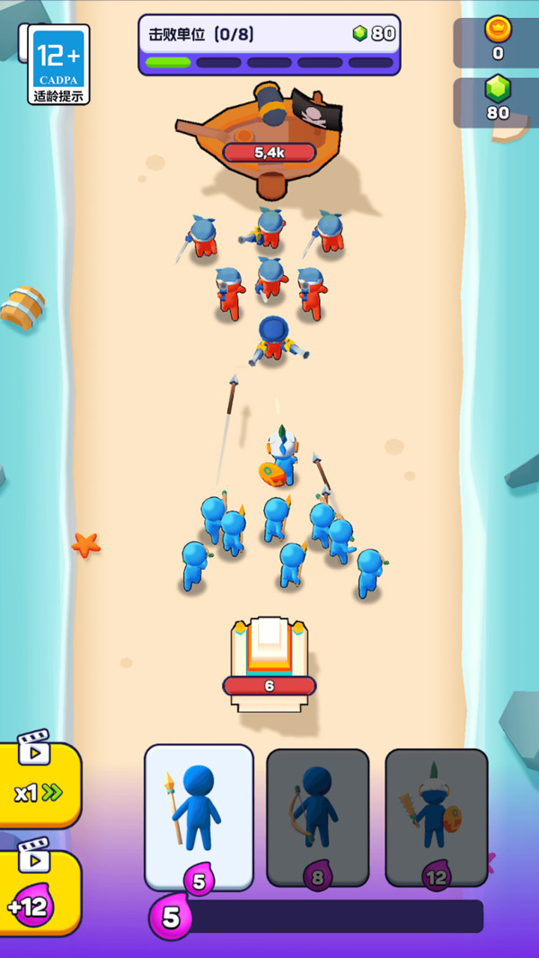 2、双方堡垒进击玩法,派遣士兵击败敌人获得金币,最终击破敌人堡垒获胜。