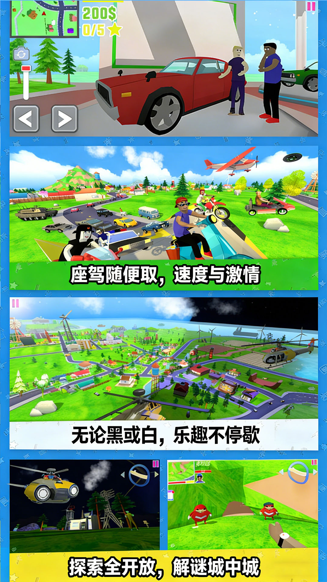 发疯小镇模拟器是一款在开放的地图之上到处探索的动作冒险游戏,玩家可驾驶载具,如跑车、直升机,穿梭于城市、郊区或荒野,探索隐藏地点,如地下基地、废弃工厂。与NPC或环境互动触发随机事件,例如抢劫商店、参与街头赛车,甚至用奇葩武器,如玩具枪、充气锤去制造混乱,尽情的玩耍,释放所有不开心,体验无限的乐趣。