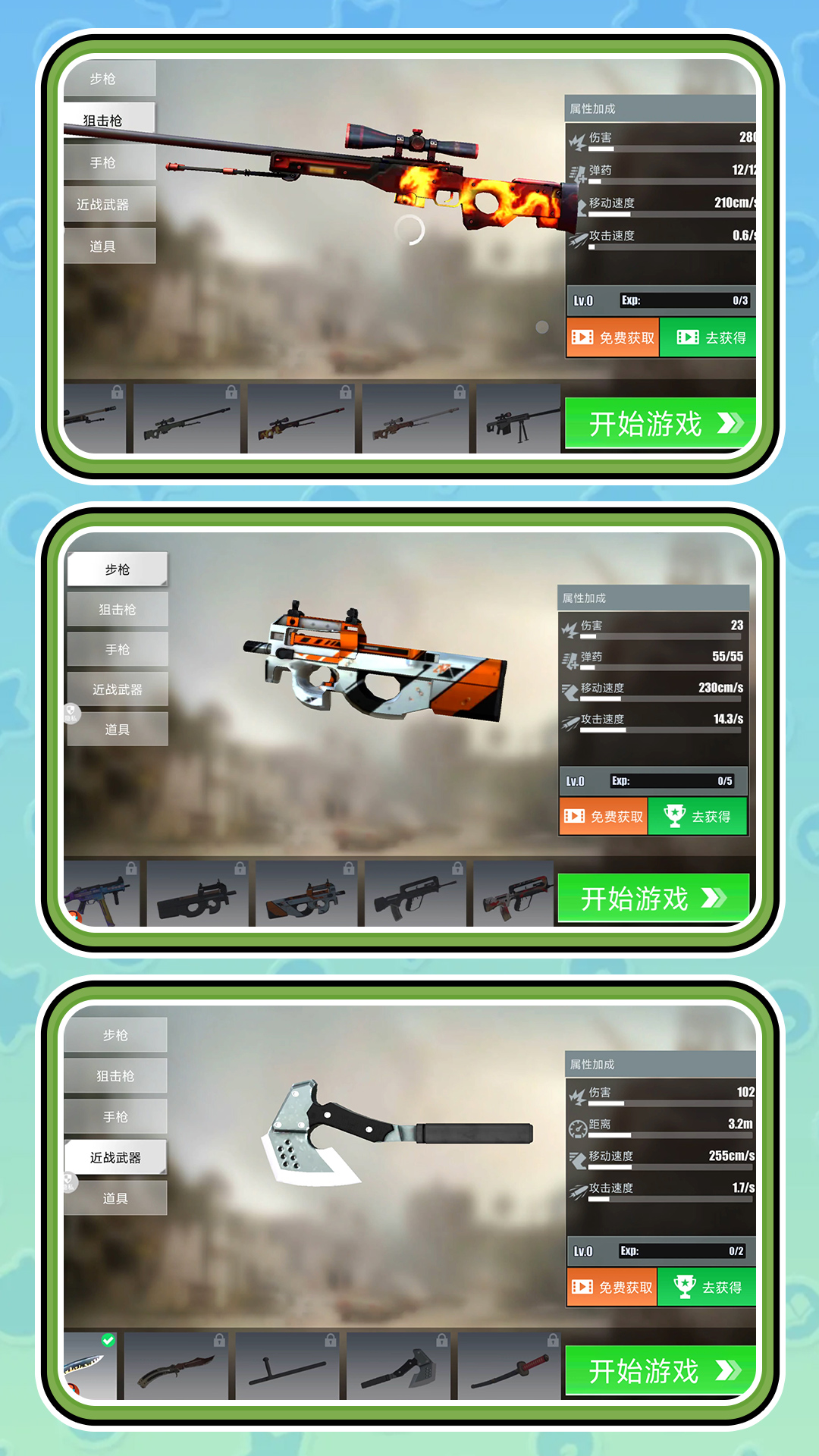 3、不同的地图面对各种怪物,你可以点击下方的武器,自由切换开始战斗;